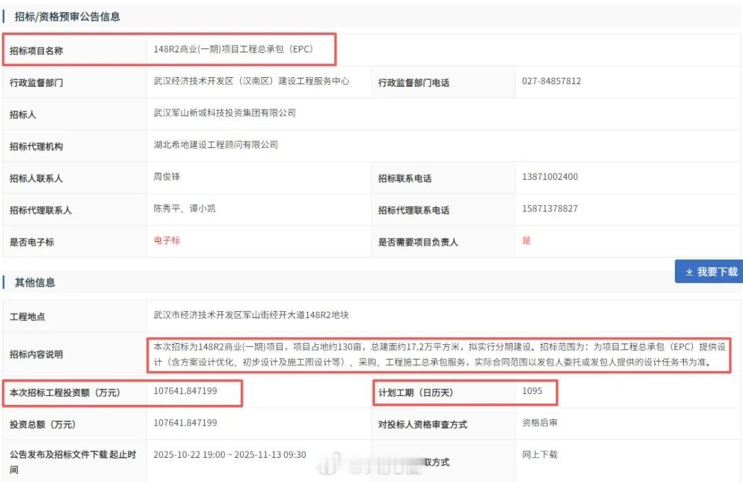 小军山万象商业项目(暂未确定为华润系)启动施工招标! 从武汉市公共资源交易中心网站获悉,148R2商业(一期)项目工程总承包(EPC)开始招标。本次招标为148R2商业(一期)项目,项目占地约130亩,总建面约17.2万平方米,拟实行分期建设。本次招标工程投资额107641.847199万元,计划工期1095天。根据此前消息,该地块计划招华润万象商业体。 据悉,经开万象系商业体选址军山新城中心地带,紧邻轨道交通16号线小军山站,总投资约25亿元,总商业体量约15万平方米,将打造集总部办公、科技研发、品质商业等为一体的城市综合体,承载片区现代服务业中心的职能。 24年3月,武汉经济技术开发区管委会针对网友关心的项目进展进行了回复:经核实,该项目建设方案尚在深化阶段,下一步待项目开发方案确认后启动建设,暂无法确定具体动工与建设完成时间,我区军山新城管理办将持续跟踪,加快项目实施进度,推动项目尽快开工。 经调查并向相关部门咨询核实,小军山片区目前暂没有供地给华润万象汇。您所咨询华润万象汇项目的地块为武汉车谷城市投资发展有限公司于2022年取得土地使用权,该地块用地为规划控制的商务金融用地,华润万象汇项目为其当时宣传广告,并未最终确定。