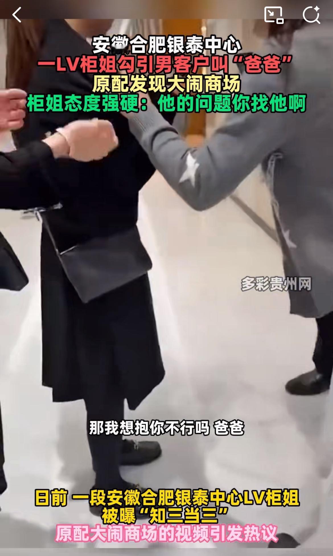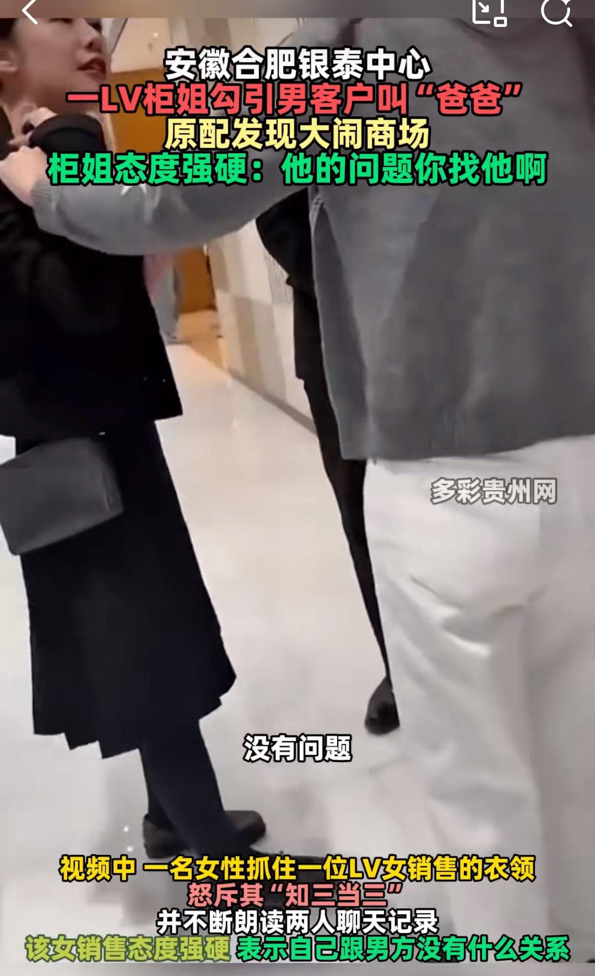 吃瓜,合肥一高端商场LV柜姐和客户勾搭,被原配抓到。柜姐强硬回应:你老公的问题找他去。两人唇枪舌剑,对话劲爆。 柜姐:我已经把他删了; 原配:删了就好吗? 柜姐:那亲爱的,你还想让我怎样?那我坐下来聊好不好? 原配:那我想抱你可以吗?爸爸; 柜姐:可以,你说什么都可以,我是所有的东西都在,我又不是冤枉你。 柜姐:那他的问题你去找他啊; 原配:你俩有问题,我俩离婚了,明天就去办证,我想告诉你的是,他是他,你是你,渣男我一样会处理,但是也你也不会好过。 柜姐:知道吗,你让不让我好过我无所谓。 原配:因为你是惯犯; 柜姐:我本来就和他没什么好吗?