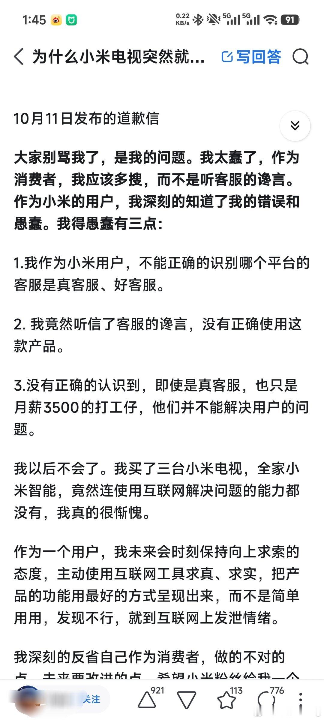 本以为这是件误会澄清的事情,没想到答主突然就破防了,解决问题之后没感谢评论区,反而开始阴阳怪气起小米来,话里话外都是自己因为不会用被喷,