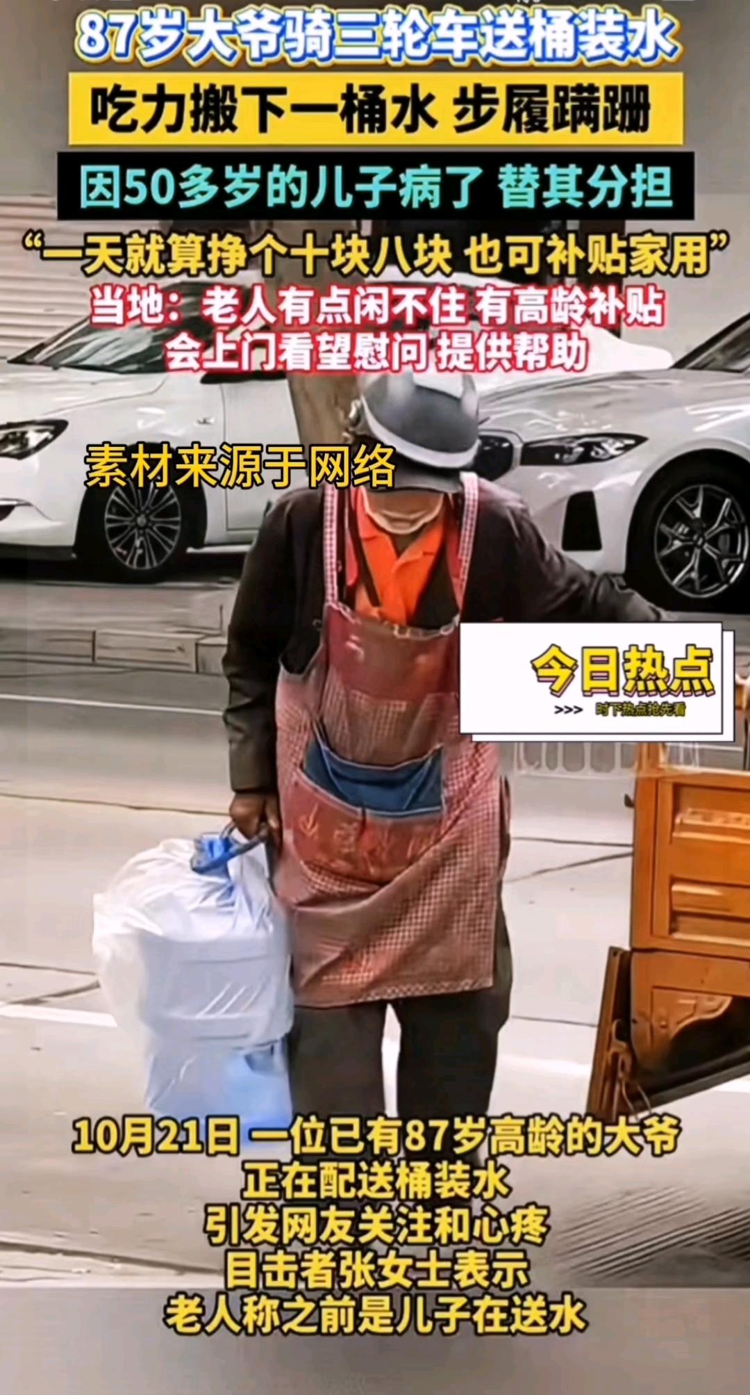 87岁的脊梁 撑起的不只是一桶水 更是一个家 本该坐在门口晒晒太阳 眯眼数着来往街坊的年纪 却要把几十斤的水桶扛肩上 一步一挪往别人家里闯 都说养儿防老 到了这把岁数倒成了养儿防饿 儿子病倒在床上 老子就得顶起这片破墙 一天挣那十块八块 不够年轻人一杯奶茶钱 却是这个家的救命钱 当地说老人闲不住 还有高龄补贴会上门看 这话听着暖心 细想却像隔靴搔痒 真要是闲不住 谁会放着舒坦日子不过 去遭这份罪 这脊梁早被岁月压弯了弧度 却还在硬撑着不向生活认输 都说老有所依是福气 可有些老人的依靠 到头来还是自己这双老骨头 敢问那些说风凉话的人 要是自家老人这般辛苦 还能笑着说一句闲不住吗 这样的"闲不住" 到底是坚强还是无奈