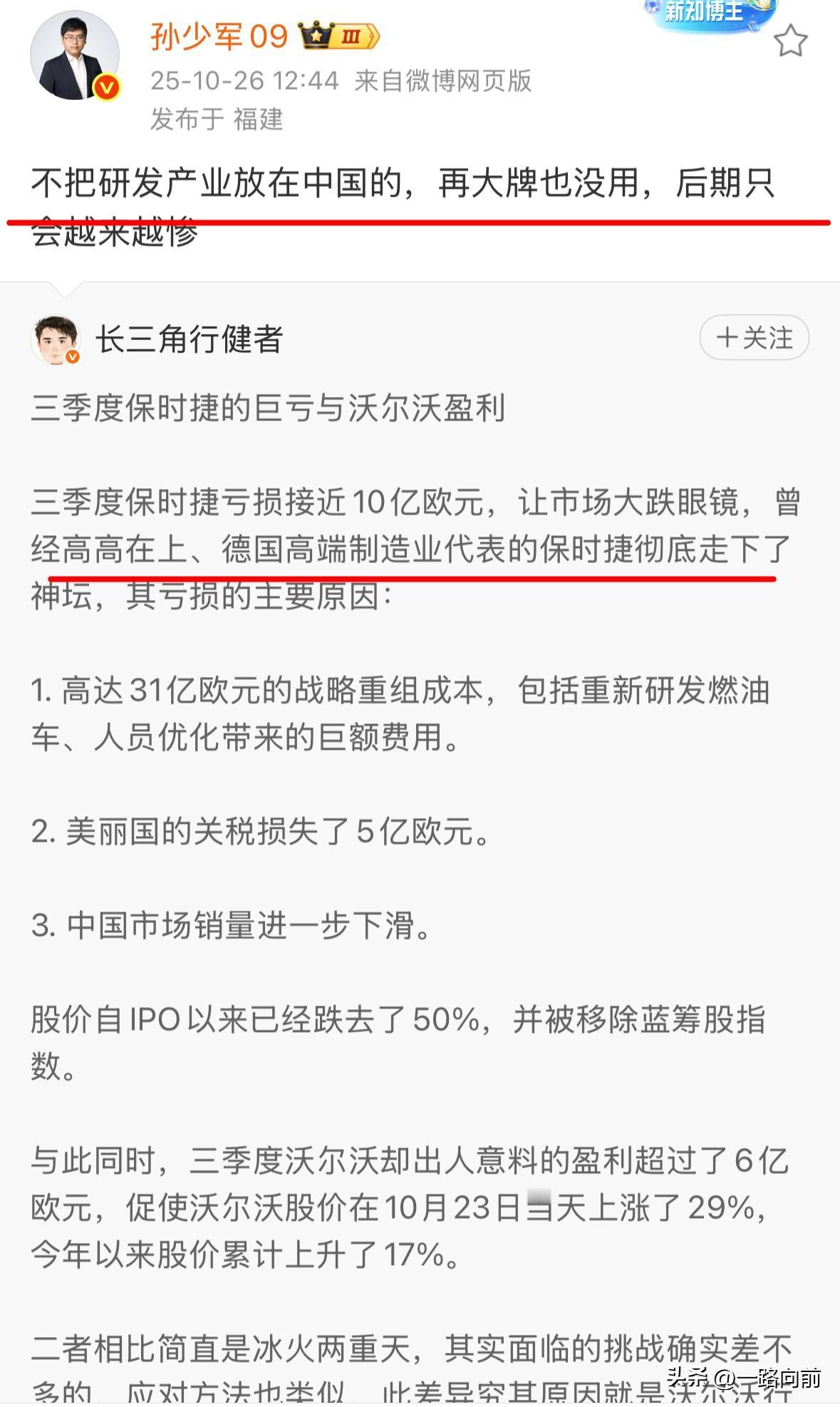 不把研发产业放在中国的,再大牌也没用,后期只会越来越惨 保时捷三季度直接亏了近10亿欧元,曾经的"豪车顶流"、德国制造的标杆,如今销量利润双双跳水,彻底从神坛走下来了。而另一边的沃尔沃却稳赚不赔,这一亏一赚的对比,把孙少军那句评论衬得太对了:"不把研发产业放中国的,再大牌也没用,后期只会越来越惨"! 先说说保时捷的"滑铁卢"有多惨烈。三季度不光巨亏,前三个季度全球销量跌了6.9%,最要命的是中国市场直接"塌房",在华销量占比从24%跌到18%,纯电车型Taycan交付量更是腰斩,同比下降50%。以前加价都抢不到的帕梅、Taycan,现在经销商都在亏本甩卖,甚至被逼得集体向总部"逼宫"要补贴。 问题到底出在哪?说白了就是没把中国市场当回事。中国51%的保时捷车主是女性,更吃"科技感"这套,可保时捷还抱着老派豪华标签不放,电动化转型磨磨蹭蹭,数智化配置更是跟不上本土品牌。最讽刺的是,面对小米SU7这样的对手,它还嘴硬说"不视为竞争对手",结果百万级预算用户全被抢走,毕竟花一半钱能买到更快、更智能的车,谁还为过时的溢价买单? 再看沃尔沃的"逆势盈利",简直是教科书级的反差。它早就把中国当成核心市场,新出的XC70直接针对国内需求做了优化:既有国人在意的1200km长续航,又保留了品牌招牌的安全配置,高强度硼钢车身+电池四重防护,精准踩中消费者痛点。没有硬撑"欧洲血统"的架子,反而踏踏实实做本土化产品,销量自然稳得住。 孙少军的评论其实点透了本质:现在的中国市场早就不是"大牌就能躺赢"的时代了。保时捷宁愿把研发中心放欧洲,让电动车适配欧洲路况,也不愿针对中国的充电环境和智能需求做调整;而沃尔沃、甚至很多中国品牌,早就把研发、生产、销售全链条扎根中国,能最快响应市场变化。