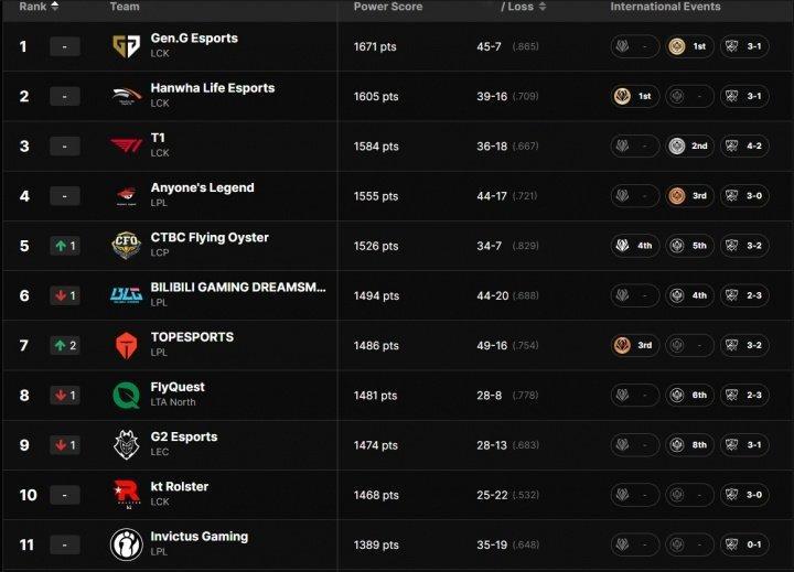 合理吗?全球战队实力榜更新:GEN第一、AL第四、BLG第六、TES第七、iG第11
