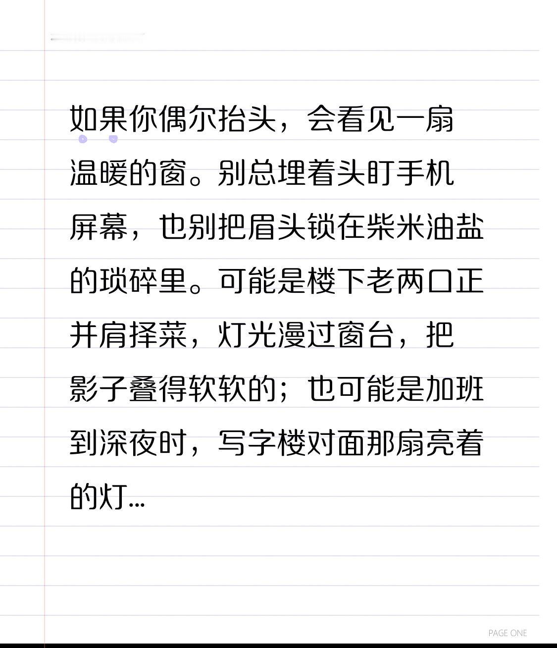 如果你偶尔抬头,会看见一扇温暖的窗。 别总埋着头盯手机屏幕, 也别把眉头锁在柴米油盐的琐碎里。 可能是楼下老两口正并肩择菜, 灯光漫过窗台,把影子叠得软软的; 也可能是加班到深夜时, 写字楼对面那扇亮着的灯, 像有人在悄悄等谁回家。 这扇窗从不是具象的框, 是我们被生活推着跑时, 最容易忽略的温柔信号—— 提醒你慢一点,再慢一点, 日子里藏着的暖,从不在低头的奔波里。 你上一次抬头,撞见的那扇“窗”,是什么模样呀?烦恼都是闲出来的,你赞同吗?