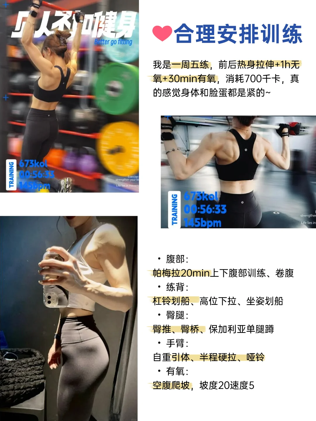我是一周五练,前后热身拉伸+1h无氧+30min有氧,消耗700千卡,真的感觉身体和脸蛋都是紧的~
