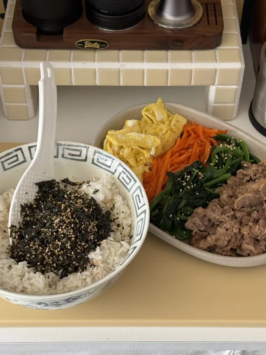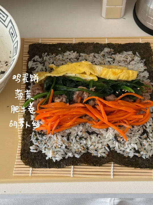 吃上圆鼓鼓的紫菜包饭了 满足[哇R] - 肥牛卷用烤肉酱腌制之后炒熟 🥕胡萝卜切丝少许油加适量盐 糖 炒熟 菠菜焯水后加香油 盐 白芝麻拌匀 鸡蛋打散煎成饼切段 - 往米饭里加了香油和海苔拌饭碎就更香了[得意R] 没有加任何酱吃着比较清淡健康[偷笑R]