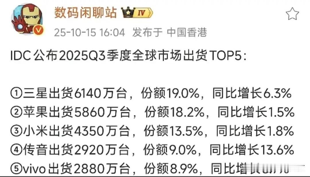 雷军去年的话印证得明明白白,全球智能手机的竞争基本结束了! 三星,6140万台。 苹果,5860万台。 小米,4350万台。 传音,2920万台。 vivo,2880万台。 前五名出货量一摆,差距大到扎眼,没上榜的品牌怕是真要被挤出局了,三星以6140万台稳坐第一,同比还涨了6.3%,靠的就是Galaxy A系列在中低端市场的横扫和折叠屏的持续发力;苹果5860万台紧随其后,iPhone 17系列的高配大内存版卖爆了,直接创下同期销售额纪录;小米4350万台守住第三,红米Note系列和Poco系列在欧洲、拉美市场扛起了销量大旗;最惊喜的是传音,2920万台重返第四,13.6%的增速是前五里最快的,“非洲之王”的地位更稳了;vivo以2880万台收尾,靠中端机型在印度、东南亚市场稳住了基本盘。 这榜单最狠的不是排名,是“马太效应”太明显。前五名里除了小米增速略输大盘,其余四家都跑赢了市场,而没进前五的品牌整体份额直接缩减了3.2%。简单说就是:头部品牌在吃肉,中小品牌连汤都快喝不上了。雷军之前就说过,国际上基本只剩苹果、三星,国内几家还在“速死比赛”里淘汰赛阶段,现在看这话真没夸张。 为啥说竞争结束了?因为头部品牌早就把路堵死了。三星靠全价位覆盖和全球渠道,从非洲贫民窟到欧洲高端商场都有它的影子;苹果靠生态和高端口碑,光靠高配机型就能赚走行业大部分利润;小米、vivo、传音更狠,精准掐住细分市场,小米攻高端、守性价比,vivo啃线下、拓海外,传音直接把功能机升级需求吃透,在非洲市场没人能打。 更关键的是,中小品牌根本没机会突围。现在做手机,要么砸几百亿搞研发,要么铺全球渠道,要么建生态,这三样门槛随便一个都能拦住小厂。之前还有品牌想靠“性价比”搅局,可现在红米、传音把低价市场做到极致,高端有苹果三星,中端有小米vivo,中间的生存空间早被挤没了。 不过国内市场还有点不一样,vivo、华为、小米这些品牌还在较劲,Q3vivo甚至以17.3%的份额蝉联国内榜首。但放眼全球,格局是真定了,前五名牢牢攥着市场话语权,后面的品牌要么被收购,要么慢慢消失。这已经不是“谁能逆袭”的问题,而是“头部怎么瓜分市场”的问题。 雷军说的“竞争结束”,其实是说“洗牌期过了”。以前还能靠一款爆款机翻身,现在没有全链条实力根本站不住脚。