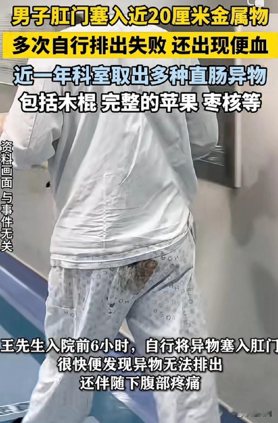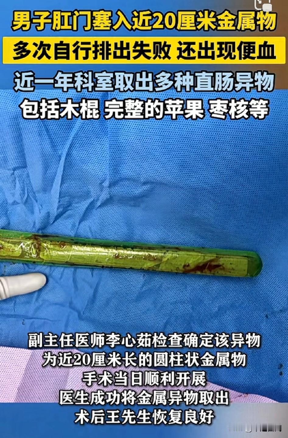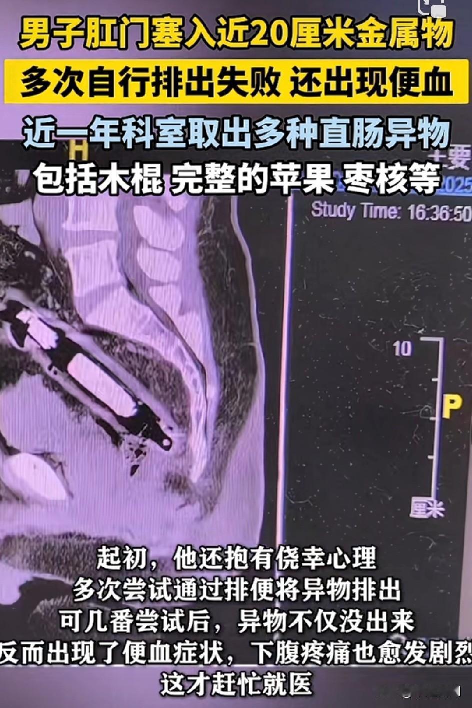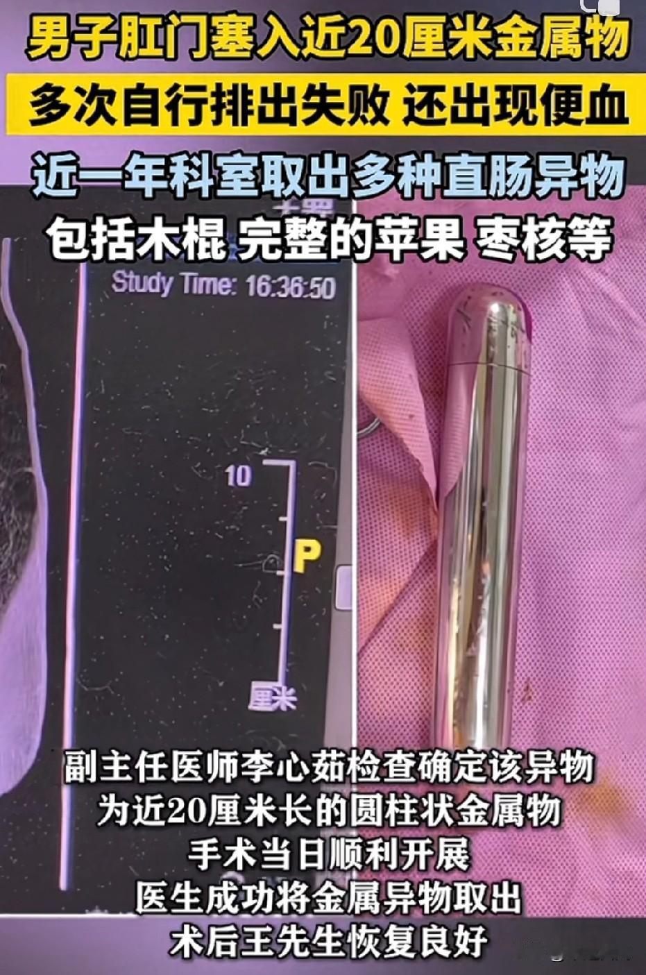 男人的耻辱,屡教不改的坏毛病! 难以启齿! 话说湖南长沙一男子肛门塞入近20厘米金属物,多次自行排出失败,还出现便血。 近一年科室取出多种直肠异物, 包括 木棍、 完整的苹果、 枣核 电击棒 尖锐不明物… 男的不应该是卡瓶子里面或者卡别的东西了吗?这事情不应该出现在女人身上吗?我的天哪,这啥事啊! 完整的苹果?日常还能兜住吗?