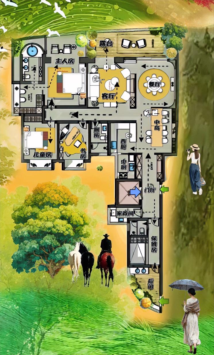看着可爱憨,格局是大师一样的通透,228㎡二毛钱的外形,有大神的动线,真相天赋异禀的,三道门! 这个户型绝对聪明,把握大门,二门,三电梯,都放在刀把子上,尤其是电梯门,有穿越时空的品质! 三动线的走向,思路清晰,动静二分离,就像玩儿似的,向上是主角光环,向下走配角路线,完全二分法,布局一点不含糊! 尤其是客餐厅一体化,看起来又精致又老城,聚餐有仙桌,早餐在中岛,重点一套一的厨房,厨中厨布局很灵动! 这个双餐双厨,绝对聪明! 八米的露台,浅浅的空间,有逗比的想法,门留给餐厅,洞给了沙发,隔而不断,多此一举,挡阳光,想装修的人,研究一下设计的心思? 二居室功能,是憨憨的外表。 三居室布局,超越常人的大脑,三口之家还是三代同堂? 书房很平凡,才是最大的潜力股,闲置做书房,孝顺做老人房,离厕所很近! 最后还是,看看工人房,带花园的小套房,更像是挟着隐私强的花房,诗情画意的烦恼区!