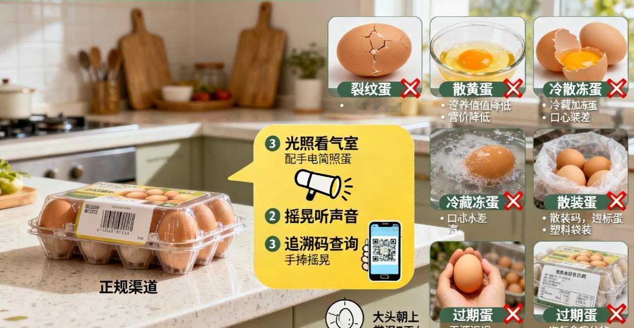 1毛钱人造鸡蛋是骗局? 学会3招挑鸡蛋, 比担心假鸡蛋有用多了 “人造鸡蛋”传言及鸡蛋选购展开,核心内容如下: 1. 辟谣人造鸡蛋泛滥:网传“成本1毛钱的人造鸡蛋”为谣言,其原料及制作成本远超真鸡蛋,且技术无法实现批量生产,2024年全国抽检8万余批次鸡蛋均未发现化学合成假蛋。 2. 明确5种需少吃的问题鸡蛋:分别是易滋生细菌的裂纹蛋、可能变质的散黄蛋(有异味者)、营养流失且易染菌的冷藏解冻蛋、无检疫风险高的散装蛋、沙门氏菌超标的过期蛋。 3. 给出实用选购与保存技巧:建议通过正规渠道购买带追溯码的鸡蛋;可通过光照看气室、摇晃听声音辨别新鲜度;保存时需大头朝上、不水洗蛋壳,常温存7天、冷藏存30天。