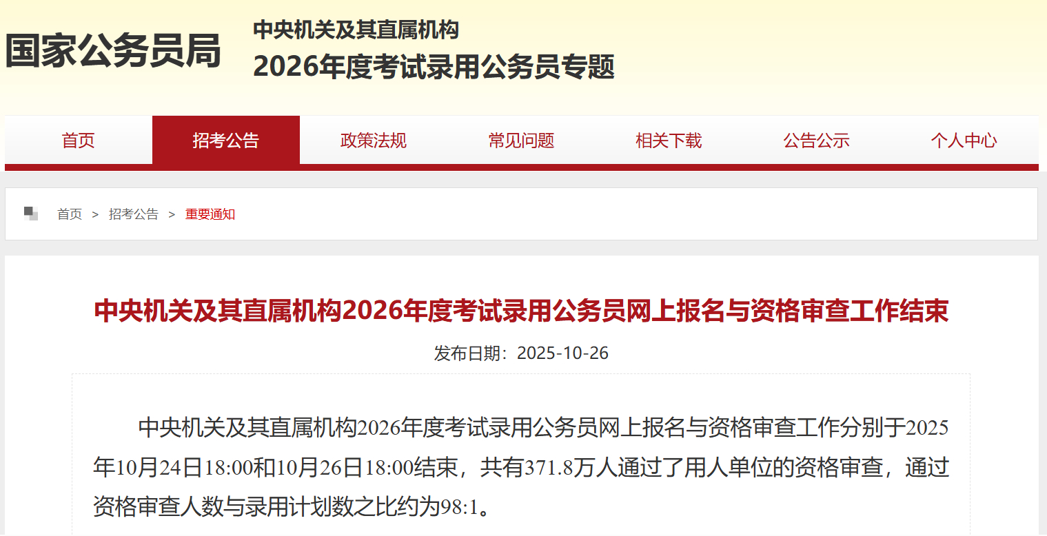 【#国考371.8万人通过资格审查#】国家公务员局网站10月26日消息,中央机关及其直属机构2026年度考试录用公务员网上报名与资格审查工作分别于2025年10月24日18:00和10月26日18:00结束,共有371.8万人通过了用人单位的资格审查,通过资格审查人数与录用计划数之比约为98:1。