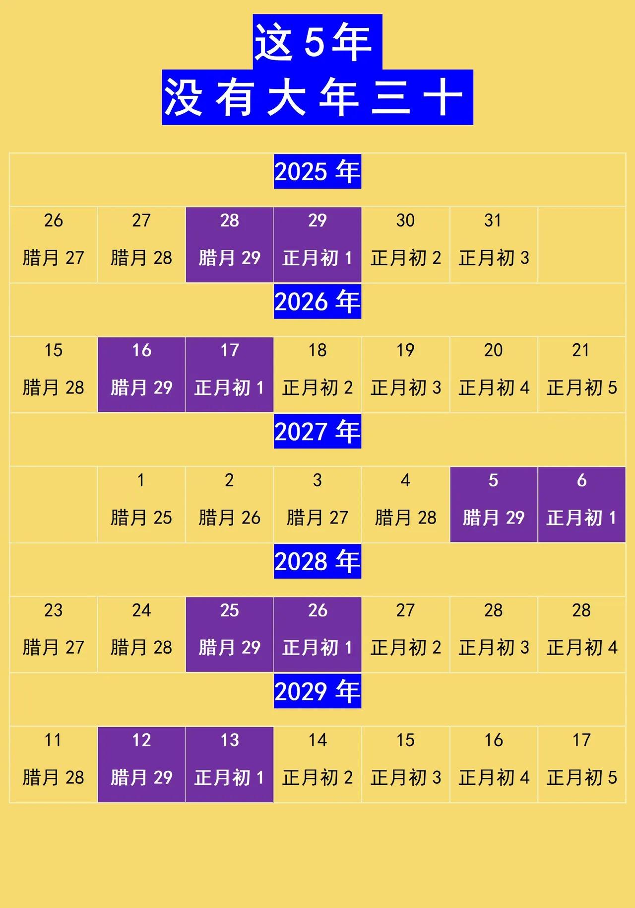 连续5年没有大年三十,有啥特殊意义吗? 从2025年到2029年,连续5年都没有大年三十,虽然在历史上也经常出现连续几年没有大年三十的情况,但是连续5年的情况还是极为少见。 没有大年三十,跟我国农历的月份计算有关,月份分为大小月,29天为小月,30天为大月。 这5年没有大年三十,就意味着连续5年的腊月都是小月,才能出现这种情况。 不过没有什么可以担心的,因为除夕夜,本来就是农历一年的最后一天,没有三十的话,那么腊月二十九就是除夕。 所以连续5年没有大年三十,并没有什么意义。