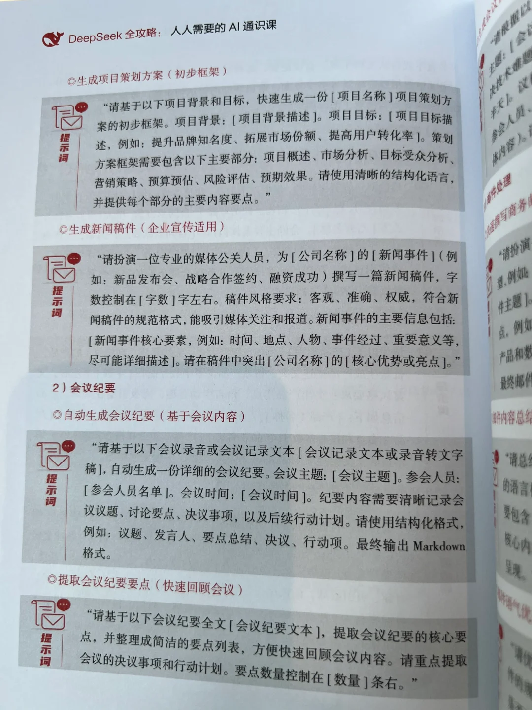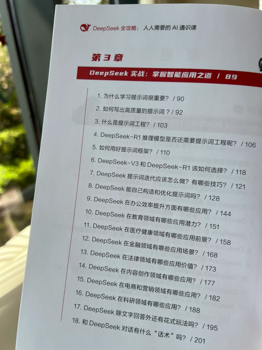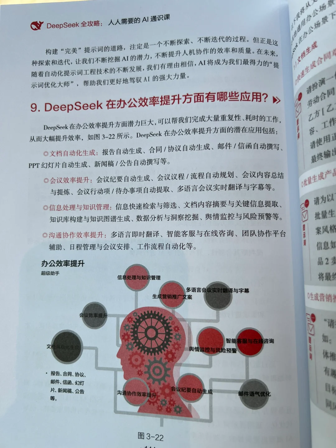 📗书名:《deepseek全攻略人人需要的AI通识课》✏️作者:陈光 🤖 AI不是选择,而是必然 — 🔴毫不夸张地说这是今年最颠覆认知的一本书! · 💼作为一个996打工人+自媒体博主,这本书简直是我的"人生外挂"💥,之前在《趋势2030》里看到关于前瞻性的内容,习惯审时度势,能大胆拥抱趋势的人才有未来,每个人都不例外 — 💼【职场篇】打工人必看! 上周用书里的"会议纪要魔法模板" 直接把2小时的会议录音👉5分钟生成重点摘要 (老板肯定以为你偷偷报了速记班🤫) · [赞R]更绝的是P149的"周报生成术",输入几个关键词就能自动产出完整周报,连"下一步计划"都帮你写得明明白白,省下的时间够我追完一部剧了📺 · 📖【学习篇】学生党福音! 书里详细拆解了如何用DeepSeek: ✔️自动整理文献重点 ✔️生成个性化复习计划 ✔️解数学题还能分步骤讲解 (后悔没早点遇到,当年考研能省多少头发啊😭) · ✍️【创作篇】自媒体人狂喜! 我的爆文秘诀: 💡用书里的"爆款标题公式"生成20个备选 💡再结合"情感化改写技巧"优化文案 · 🌟超实用功能清单: 1️⃣ 自动生成Excel公式(财务人哭了) 2️⃣ 法律文书智能校对(律师朋友说绝了) 3️⃣ 医疗报告解读(但切记要咨询医生!) 4️⃣ 代码debug神器(程序猿已跪) 没有它办不到,只有你想不到[哇R] · 💡我的使用心得: 1. 先看第1️⃣章搞懂"满血版"和"蒸馏版"区别 2. 直接翻到对应行业的提示词模板开用 3. 一定要试试"话术密码"(P201超神!) · ⚠️重要提醒: 作者反复强调AI是辅助工具 核心决策还是要靠人类智慧 这个观点真的既前沿又理性! · 🎁随书福利: • 224个场景化提示词 • 各行业应用案例库 ·还有视频教学资料 (光这个就值回书价了!) · 现在这本书已经成了我的办公桌常驻 封面快被翻起皱了... 求多出这种宝藏书啊! · PS:你们最想用AI解决什么问题? 评论区告诉我,我可以分享对应的书摘哦~👇