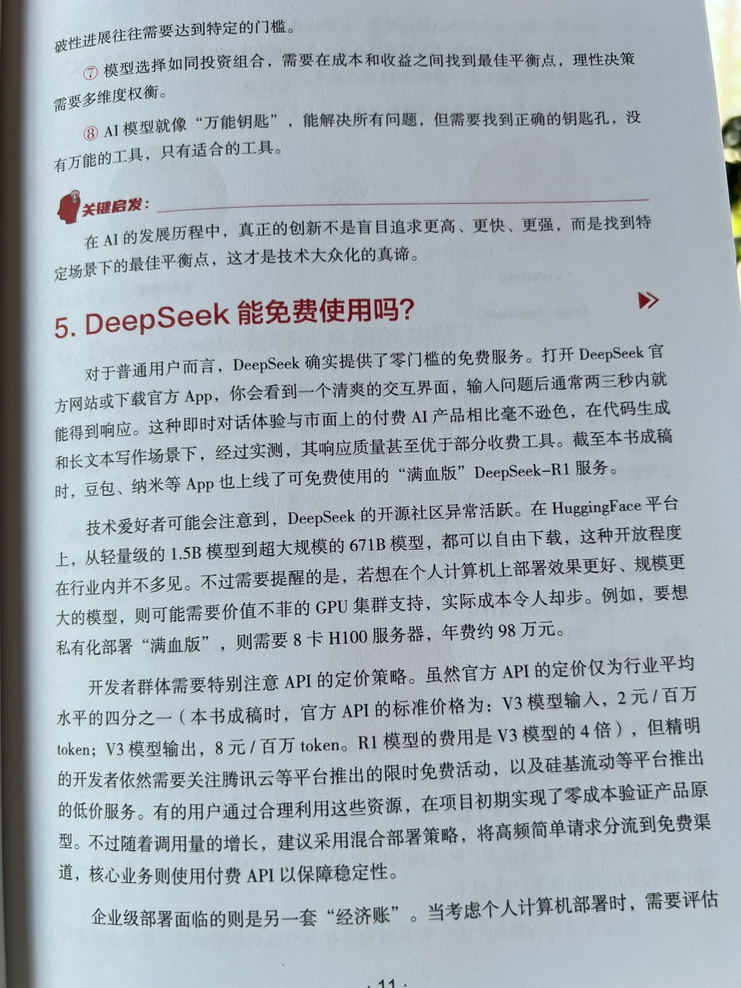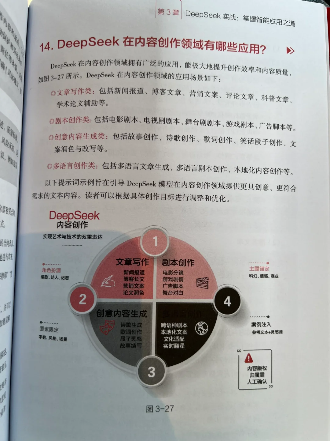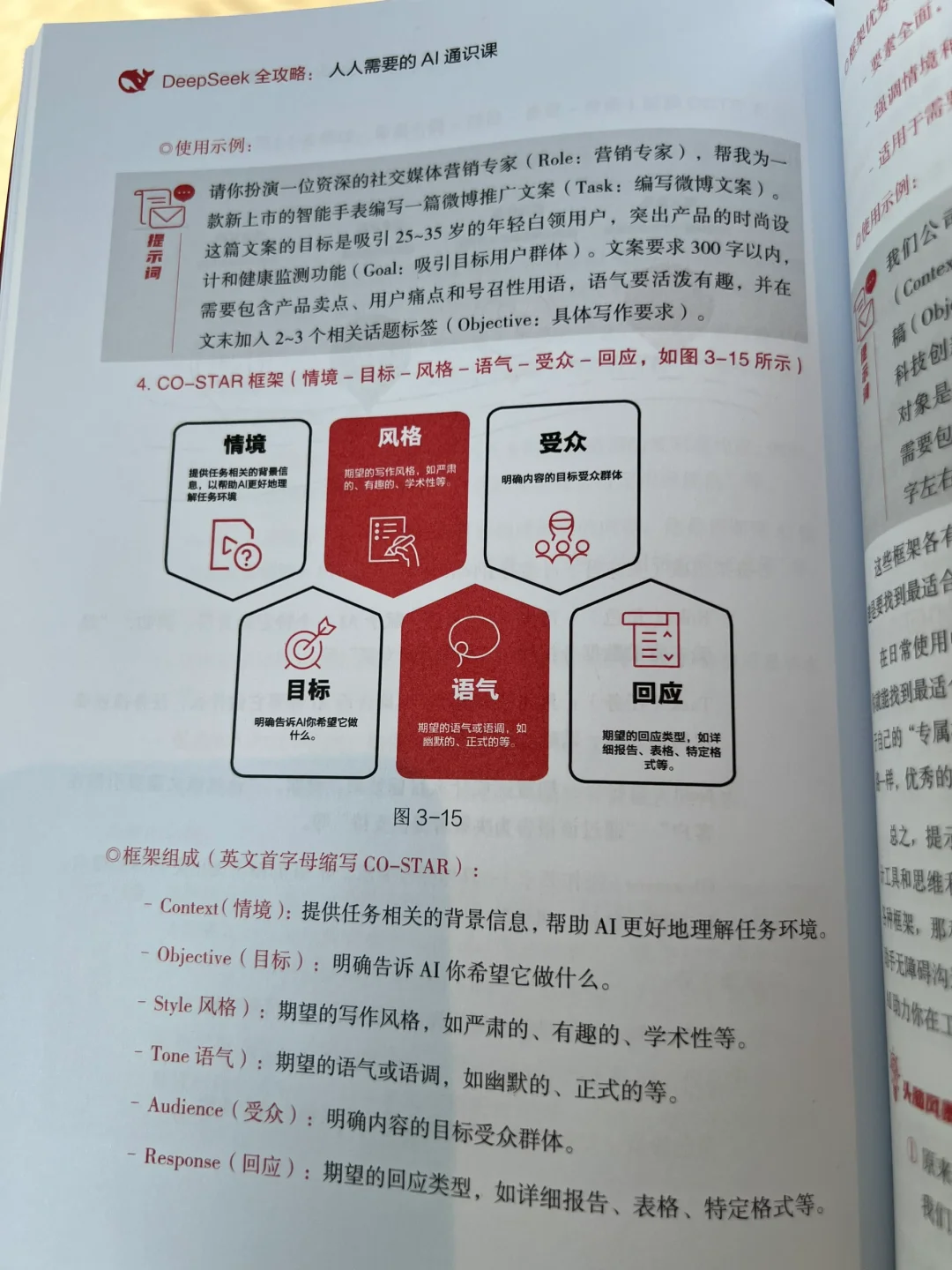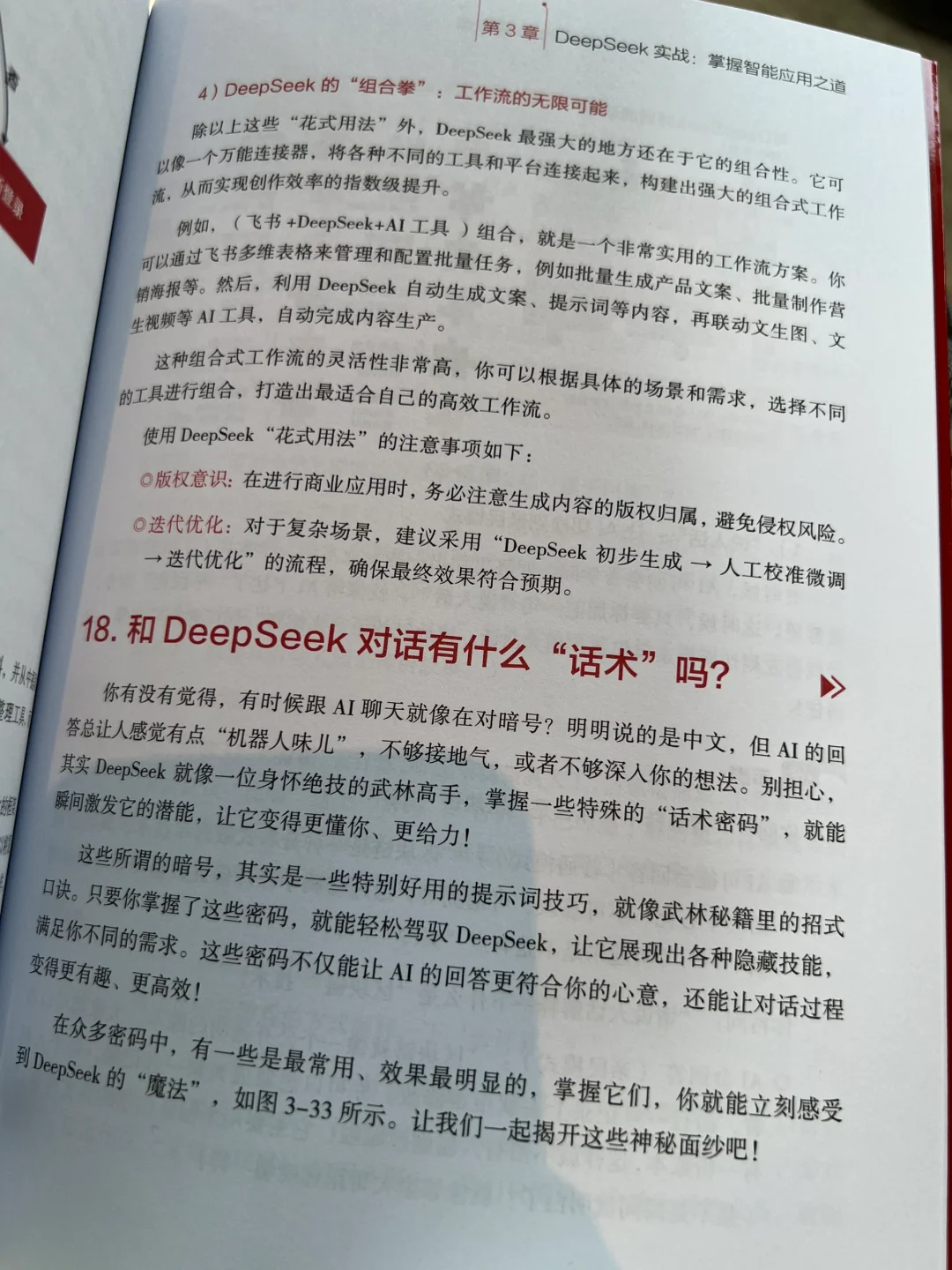 📗书名:《deepseek全攻略人人需要的AI通识课》✏️作者:陈光 🤖 AI不是选择,而是必然 — 🔴毫不夸张地说这是今年最颠覆认知的一本书! · 💼作为一个996打工人+自媒体博主,这本书简直是我的"人生外挂"💥,之前在《趋势2030》里看到关于前瞻性的内容,习惯审时度势,能大胆拥抱趋势的人才有未来,每个人都不例外 — 💼【职场篇】打工人必看! 上周用书里的"会议纪要魔法模板" 直接把2小时的会议录音👉5分钟生成重点摘要 (老板肯定以为你偷偷报了速记班🤫) · [赞R]更绝的是P149的"周报生成术",输入几个关键词就能自动产出完整周报,连"下一步计划"都帮你写得明明白白,省下的时间够我追完一部剧了📺 · 📖【学习篇】学生党福音! 书里详细拆解了如何用DeepSeek: ✔️自动整理文献重点 ✔️生成个性化复习计划 ✔️解数学题还能分步骤讲解 (后悔没早点遇到,当年考研能省多少头发啊😭) · ✍️【创作篇】自媒体人狂喜! 我的爆文秘诀: 💡用书里的"爆款标题公式"生成20个备选 💡再结合"情感化改写技巧"优化文案 · 🌟超实用功能清单: 1️⃣ 自动生成Excel公式(财务人哭了) 2️⃣ 法律文书智能校对(律师朋友说绝了) 3️⃣ 医疗报告解读(但切记要咨询医生!) 4️⃣ 代码debug神器(程序猿已跪) 没有它办不到,只有你想不到[哇R] · 💡我的使用心得: 1. 先看第1️⃣章搞懂"满血版"和"蒸馏版"区别 2. 直接翻到对应行业的提示词模板开用 3. 一定要试试"话术密码"(P201超神!) · ⚠️重要提醒: 作者反复强调AI是辅助工具 核心决策还是要靠人类智慧 这个观点真的既前沿又理性! · 🎁随书福利: • 224个场景化提示词 • 各行业应用案例库 ·还有视频教学资料 (光这个就值回书价了!) · 现在这本书已经成了我的办公桌常驻 封面快被翻起皱了... 求多出这种宝藏书啊! · PS:你们最想用AI解决什么问题? 评论区告诉我,我可以分享对应的书摘哦~👇