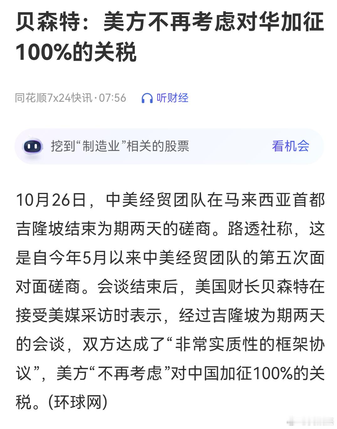 贝森特:美方不再考虑对华加征100%的关税