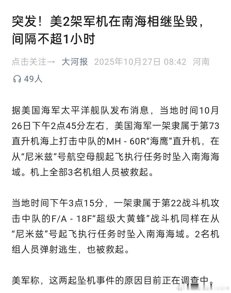 🔻美2架军机在南海相继坠毁,间隔不超1小时。美国人开始印度化了,摔飞机,还同时摔两架飞机,真是丢脸丢大了![哆啦A梦吃惊][哆啦A梦吃惊]
