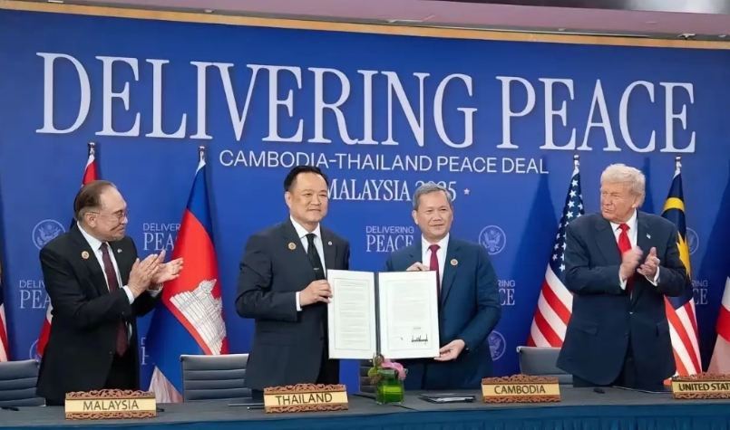 《吉隆坡和平协议》的签订,宣告了柬埔寨和泰国边境那场始于7月份的冲突的结束。照片右边星条旗前系红领带的那个老人,又可以自我吹嘘了。