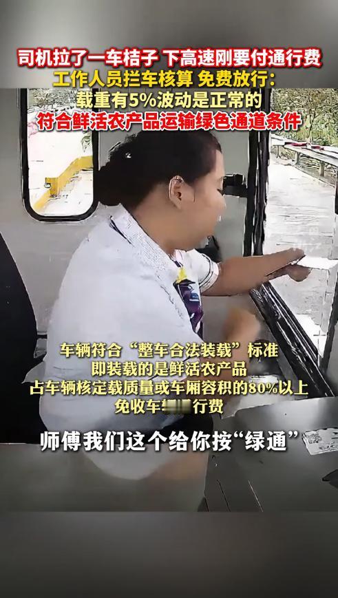 “这收费员火了!”10月16日浙江杭州,一男子拉了车橘子下高速,由于超载了几十斤,男子以为走不了“绿通”,就打算支付通行费,没想到,收费员主动索要行驶证帮他核算,结果发现刚好超载5%,依然可以免费!网友:这才叫为人民服务。[作揖] 一车橘子超重几十斤,司机已经准备好掏钱缴费,收费员却突然拦住他,先别急我帮您算算。 上午一位货车司机拉着一车橘子驶下高速,过磅称重时显示超载了几十斤,司机心里一沉,以为这回绿通免费政策肯定享受不到了,随即把车停好,准备按规定缴纳通行费。 这时当班的收费员多问了一句,在确认车上装载的全是新鲜橘子后,他并没有直接收费,而是向司机要来了车辆的行驶证,他仔细核对了行驶证上标注的整车质量,然后开始计算。 虽然货物总重确实超过了行驶证标明的核定质量,但超出的部分,刚好卡在国家对于鲜活农产品运输绿色通道规定的5%合理误差范围之内,这车橘子依然完全符合免费通行的条件。 这件小事被发到网上后,瞬间戳中了无数网友的内心,大家纷纷为收费员的举动点赞。 “这哥们儿真是个实在人,现在好多地方巴不得你多交钱,他能主动帮你核算,这种工作态度太难得了必须点赞。” “这才是真正地把政策用活了,规定是死的人是活的,收费员没有死板地执行规定,而是真正理解了政策帮助老百姓的初衷,点个大大的赞。” “看到这个心里一暖,我也是跑货运的深有体会,有时候差一点点,碰上较真的就得自认倒霉,这种被理解的感觉,能让司机高兴一整天。” “这个5%的宽容度设置得就很科学,考虑到了实际运输中的各种变量,比如水分蒸发、包装重量,政策有温度执行的人更有心,这才是好样的。” “建议给这位收费员嘉奖,这种正能量应该被表扬和宣传,每个行业都需要这样的榜样,让为人民服务不只是一句口号。” “小事见人品可能对他来说只是举手之劳,但对司机师傅来说,省下的可是实实在在的血汗钱,这种善意会传递下去的。” “对比太鲜明了,遇到过各种刁难,突然看到这么通情达理的,反而有点不习惯了,希望这样的工作人员越来越多,社会风气会更好。” “关键是他本可以不管,轻松收费完事,但他选择了更麻烦的方式去帮助别人,这种多管闲事的精神,恰恰是我们社会最需要的。” “看来以后遇到事得多问一句,多了解一下政策细节,说不定就有转机呢,感谢这位收费员,也感谢分享这个故事的人,让大家学到了。” 你在日常办事或出行时,有没有遇到过类似因为工作人员多一份细心而让你感到方便或温暖的时刻?欢迎在评论区聊聊你的见闻和感受。 信息来源:美丽浙江