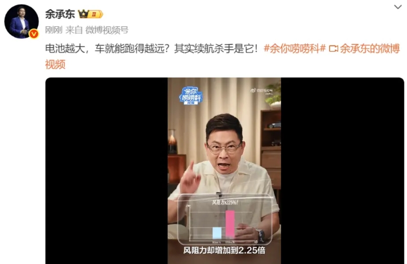 华为余总近来出镜风格有所转变,不过理工男的特质依旧难以掩藏。 当下处于自媒体时代,华为余承东能够频繁出镜为自家产品宣传。此前他侧重于讲解产品,最近风格却有了很大变化,开始讲起了技术。今日所讲内容是,影响电池续航的最大因素是风阻,占比超 70%。上次则介绍了柔光屏的制作原理与工艺,提及生产过程中运用了芯片所用的光刻机。余总的风格是以技术来证明产品,没有套路,也没有小字条款,理工男终究做不来违背科学原理。