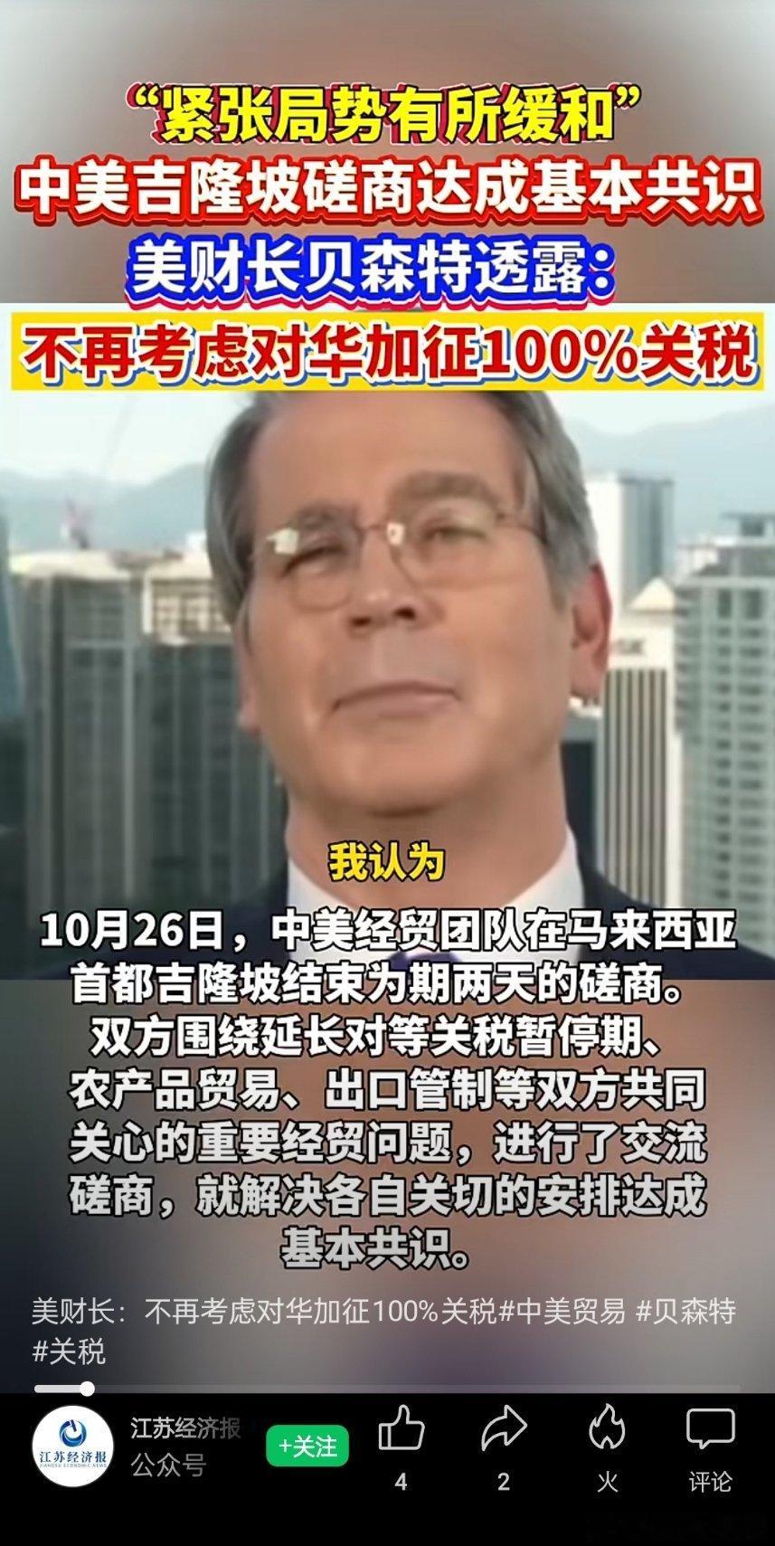 🔻中美吉隆坡磋商达成基本共识,美财长贝森特透露:不再考虑对华加征100%关税。
