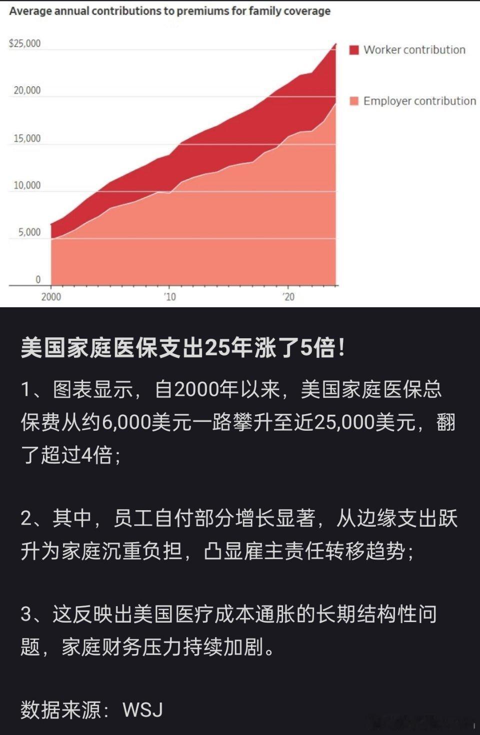 🔻美国家庭医保费用25年涨了5倍!从6000美元一张飙升到25000美元。在美国打工的华人嘴巴真严啊,赚那点钱都不够看病的。[哆啦A梦吃惊][哆啦A梦吃惊]