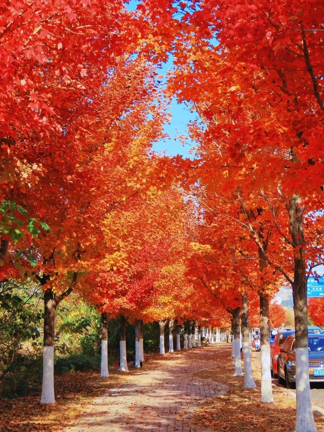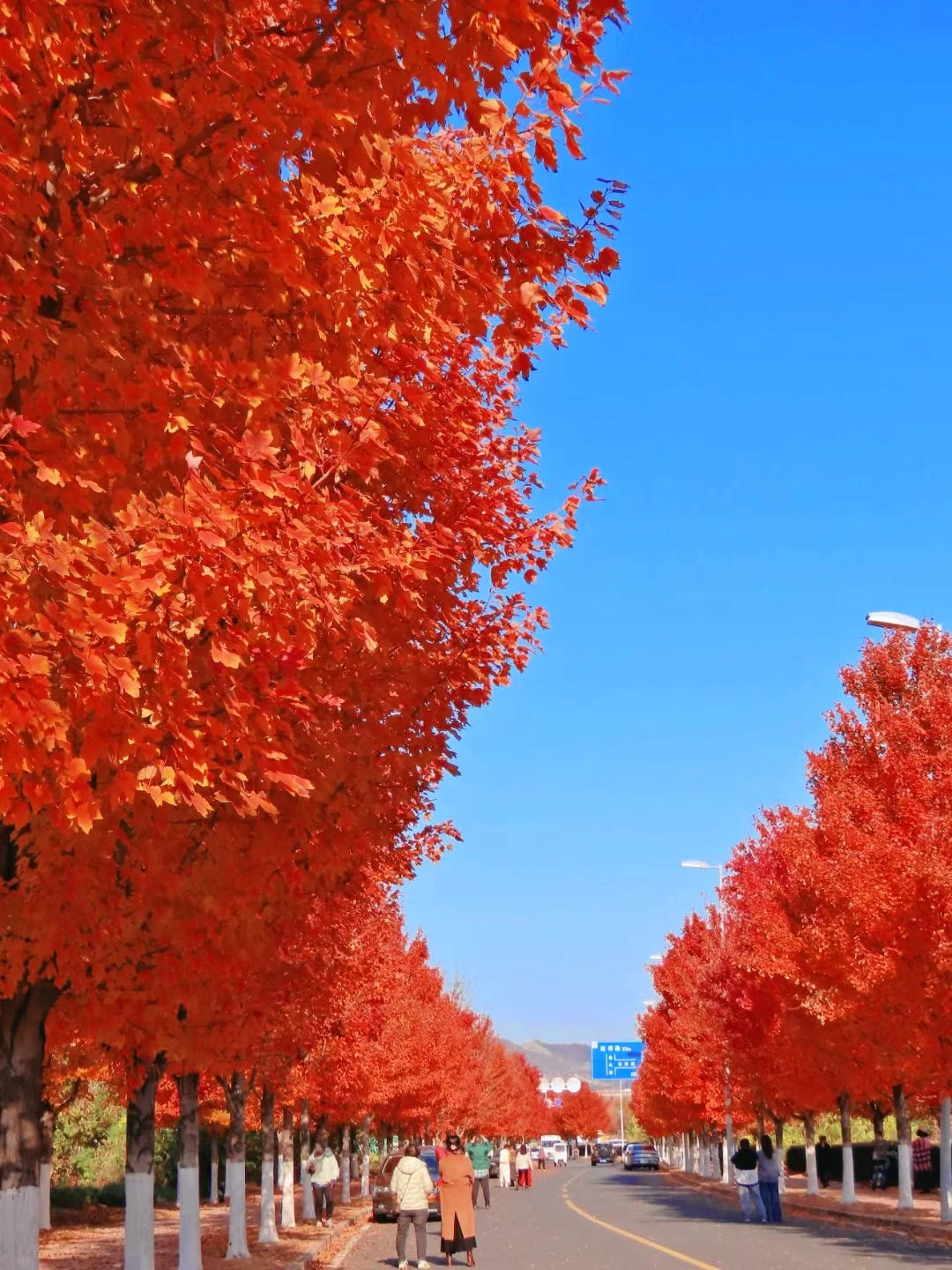 经十路红枫大道,紧靠汤山金乌公园,每年11月路两边的红枫叶,会以最绚烂如火的色彩拥抱秋天