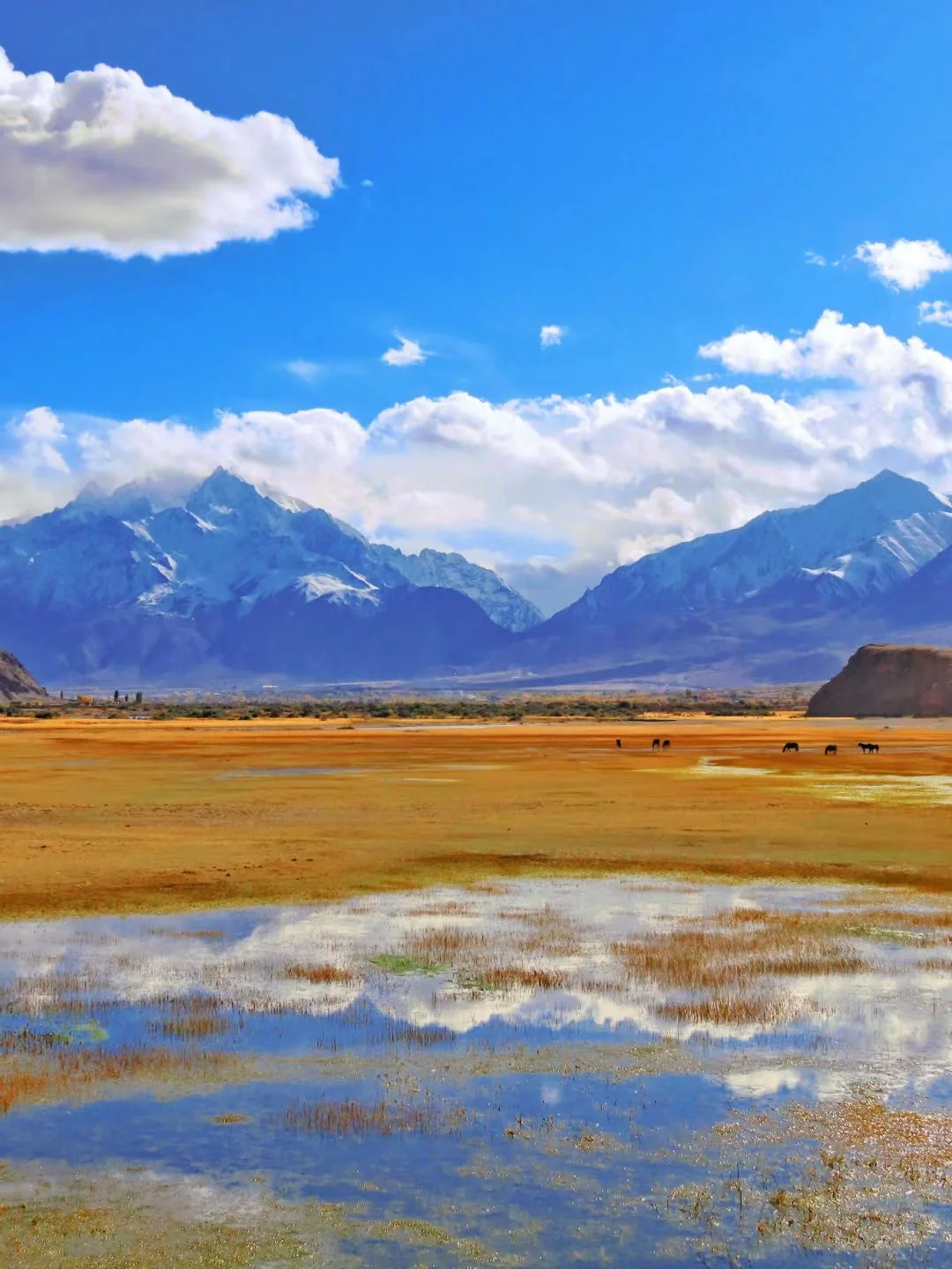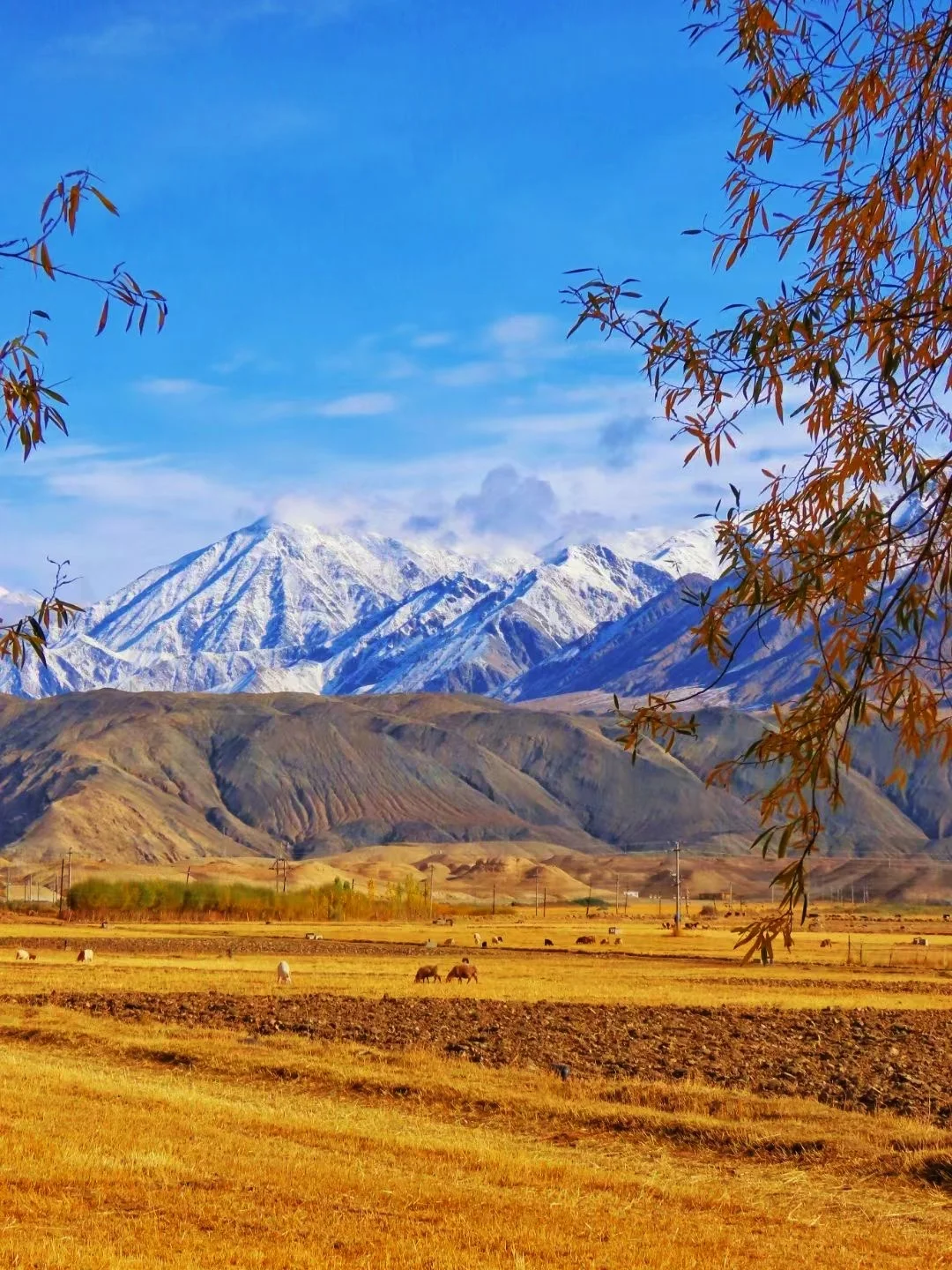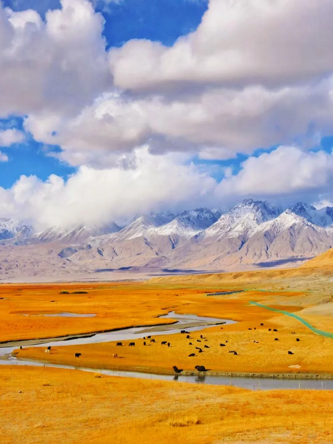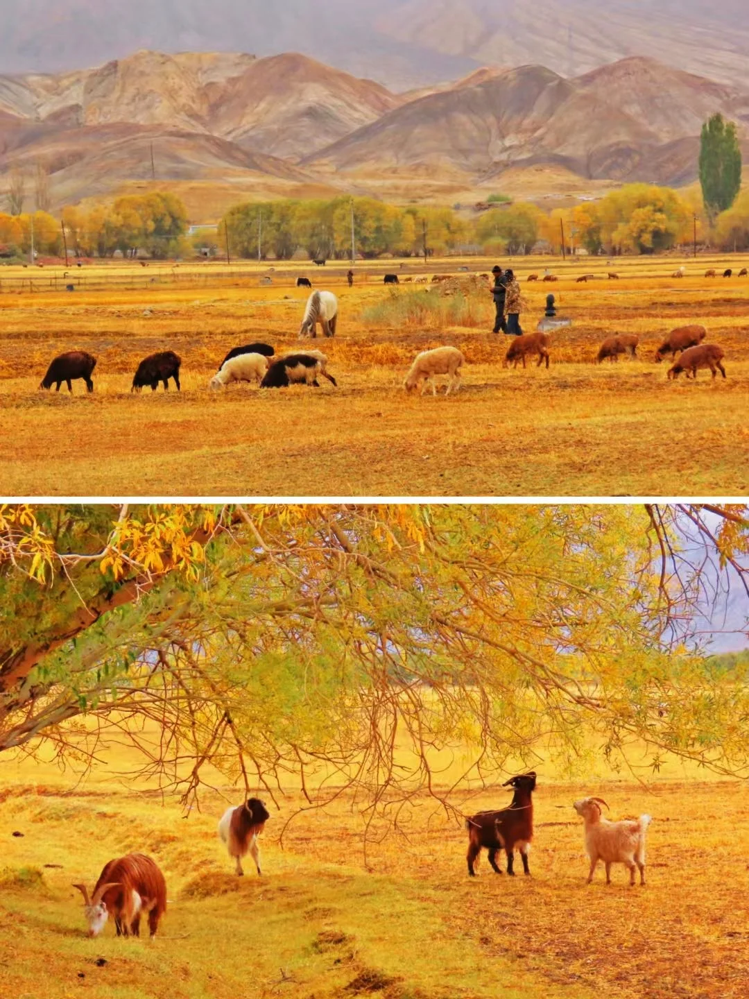 ✅帕米尔高原平均海拔3千多米,秋色最美的地方当属塔合曼乡,这里被雪山环绕,随处可见大片的牧场和牛羊