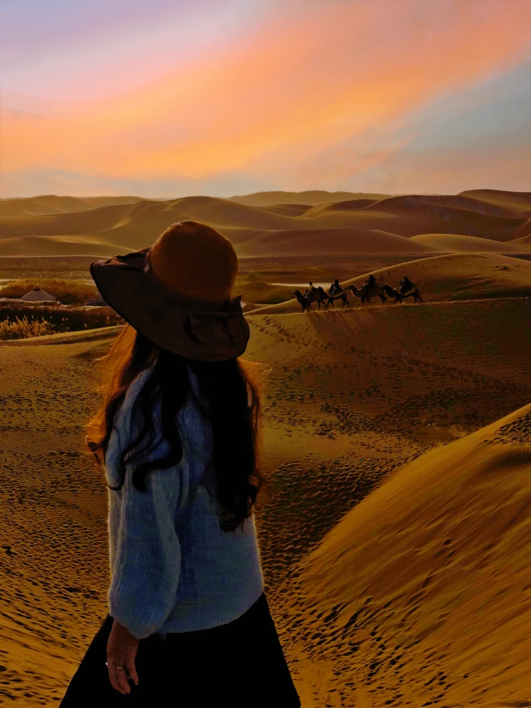 景区比较大,建议乘坐景区观光车,最后一站神女湖这里的沙漠落日绝美