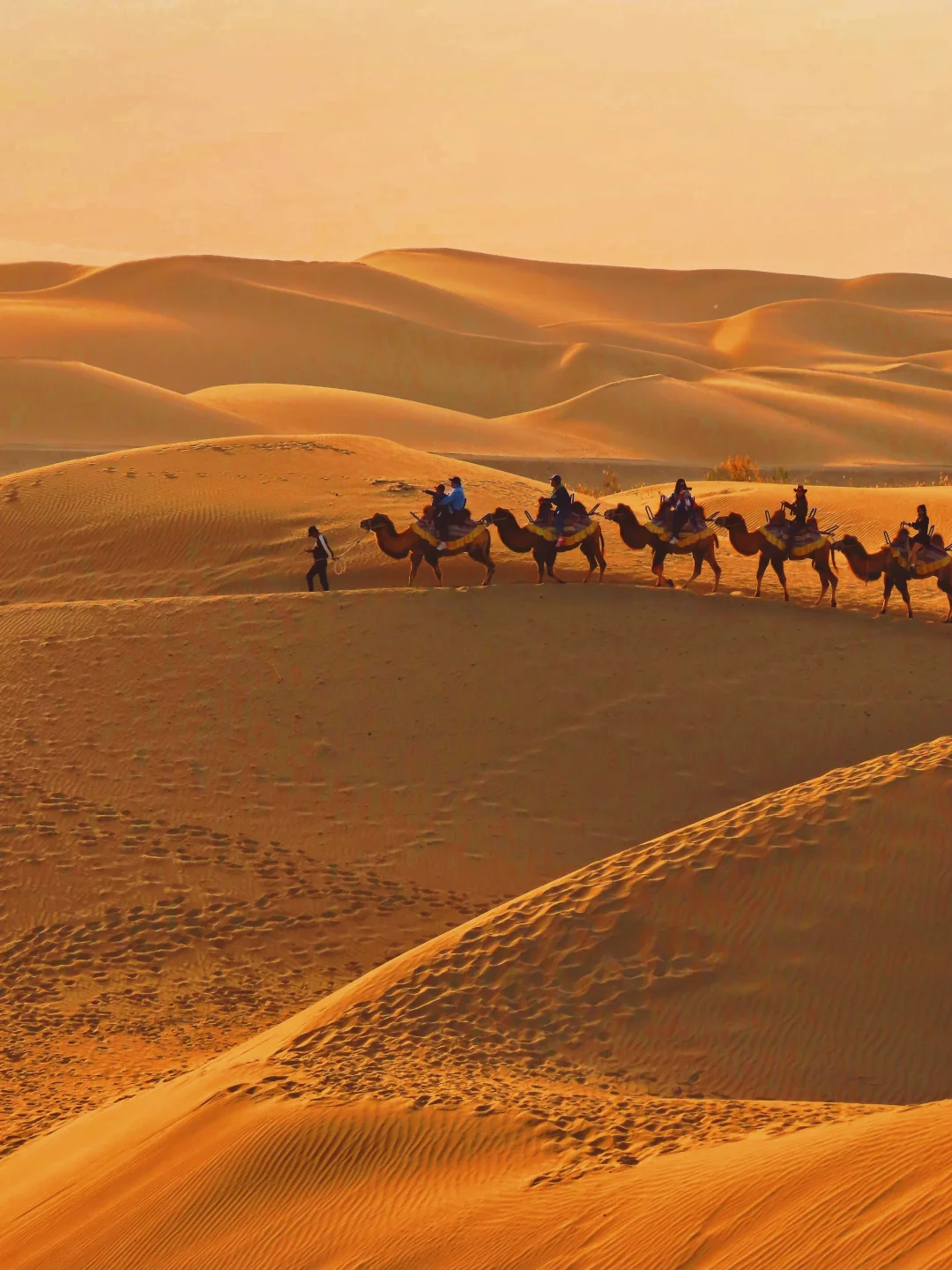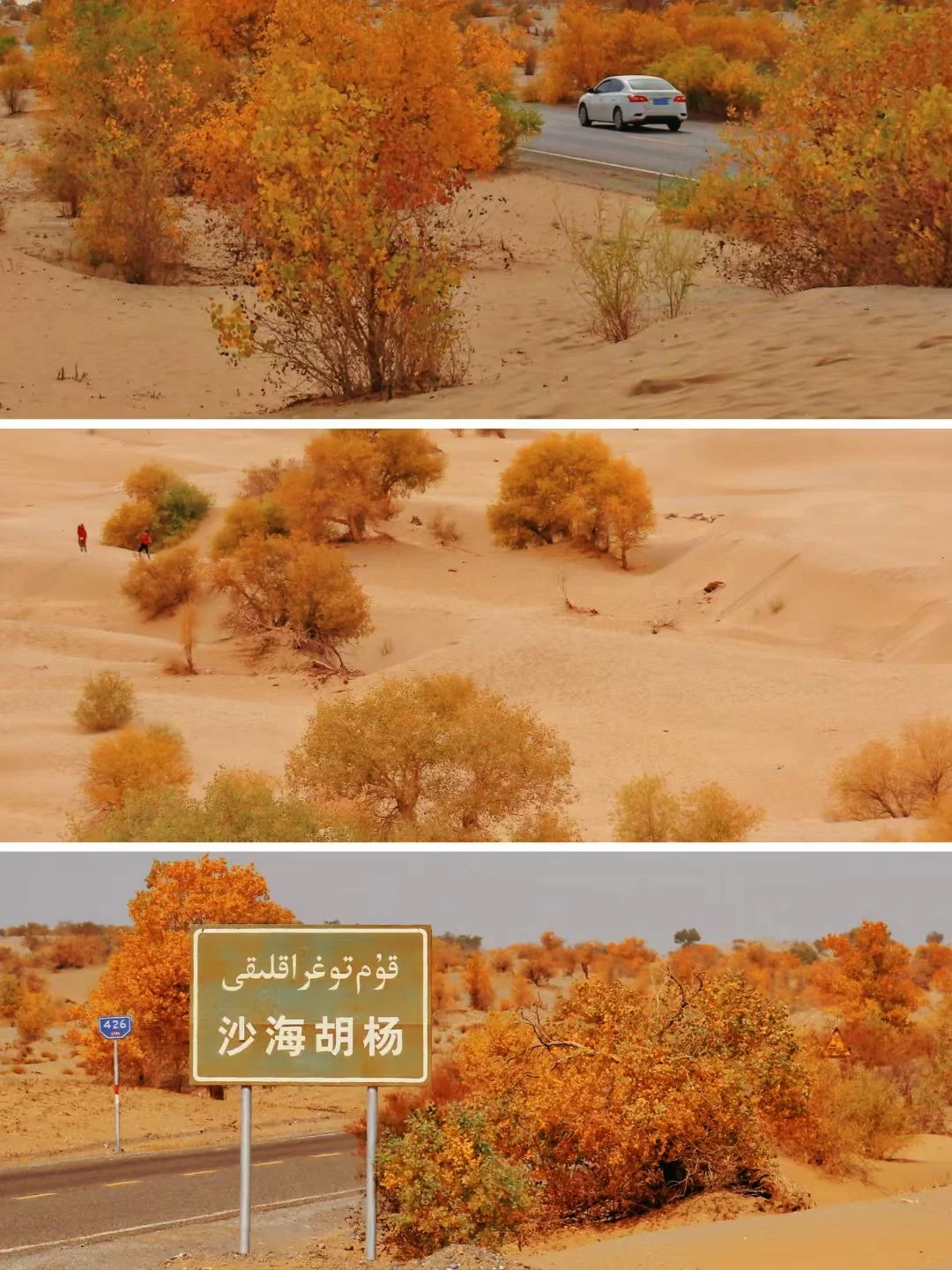 高耸的雪山、成群的牛羊、黄灿灿的草甸、胡杨林和夕阳下的塔克拉玛干沙漠