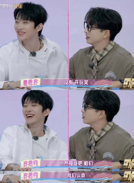 [私信R]怎么看待别人给你们打的“聪明”的标签?曹恩齐:说的对吧……观众的眼睛是雪亮的 [大笑R]哈哈哈哈哈哈哈曹恩齐还是太强了 [私信R]喜欢这样的标签吗? 小齐 恩齐:喜欢[偷笑R] 哥几个还是太有综艺感了[斜眼R]