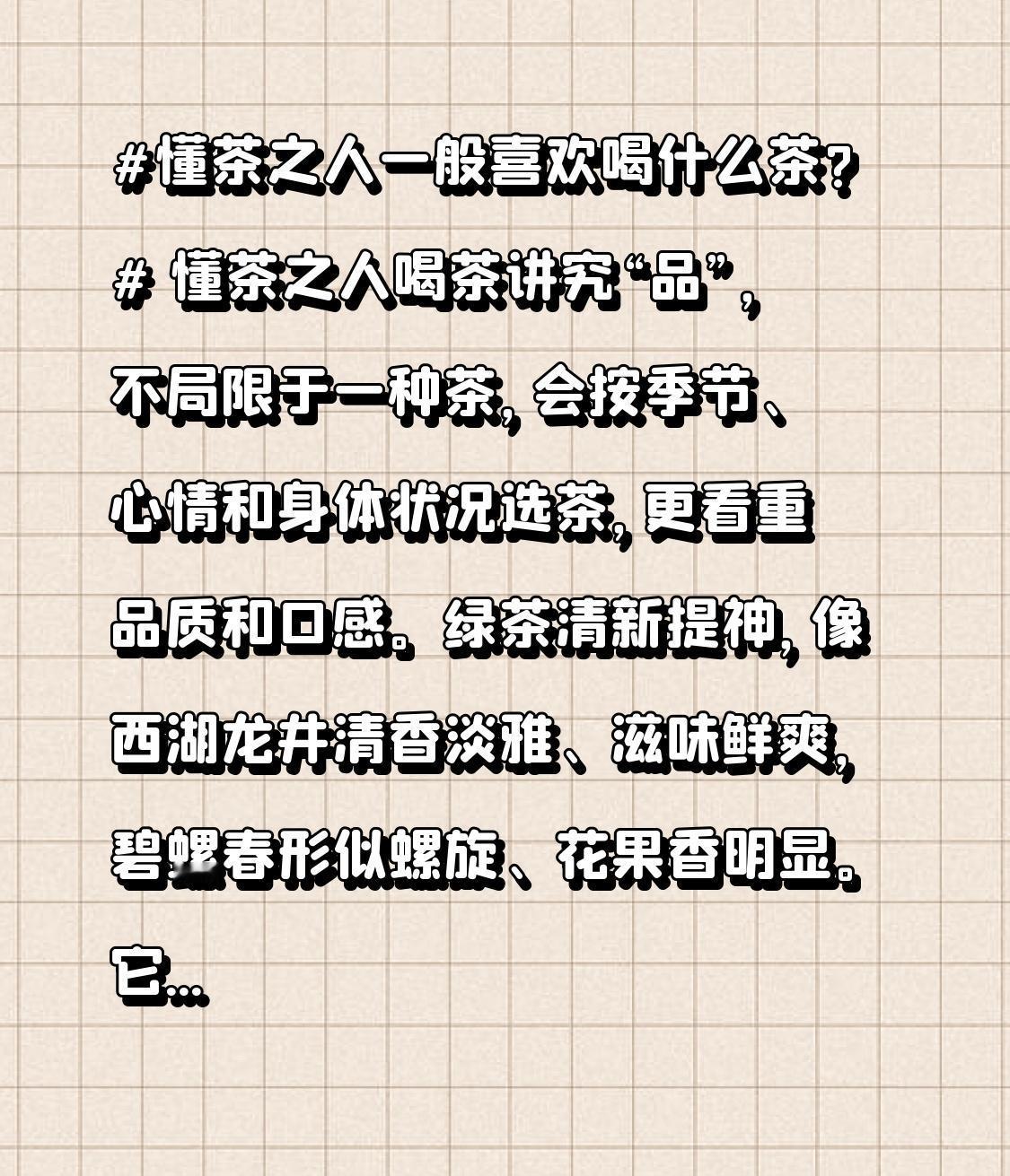 懂茶之人一般喜欢喝什么茶? 懂茶之人喝茶讲究“品”,不局限于一种茶,会按季节、心情和身体状况选茶,更看重品质和口感。 绿茶清新提神,像西湖龙井清香淡雅、滋味鲜爽,碧螺春形似螺旋、花果香明显。它未经发酵,保留天然物质,早上来一杯神清气爽,适合工作时喝。 红茶醇厚温暖,祁门红茶有“红茶皇后”之称,金骏眉口感细腻。全发酵的它经过多道工艺,适合秋冬,能暖胃消食。 乌龙茶半发酵,层次丰富。铁观音兰花香高扬,大红袍是武夷岩茶之王。懂茶的人常根据个人口味选它。