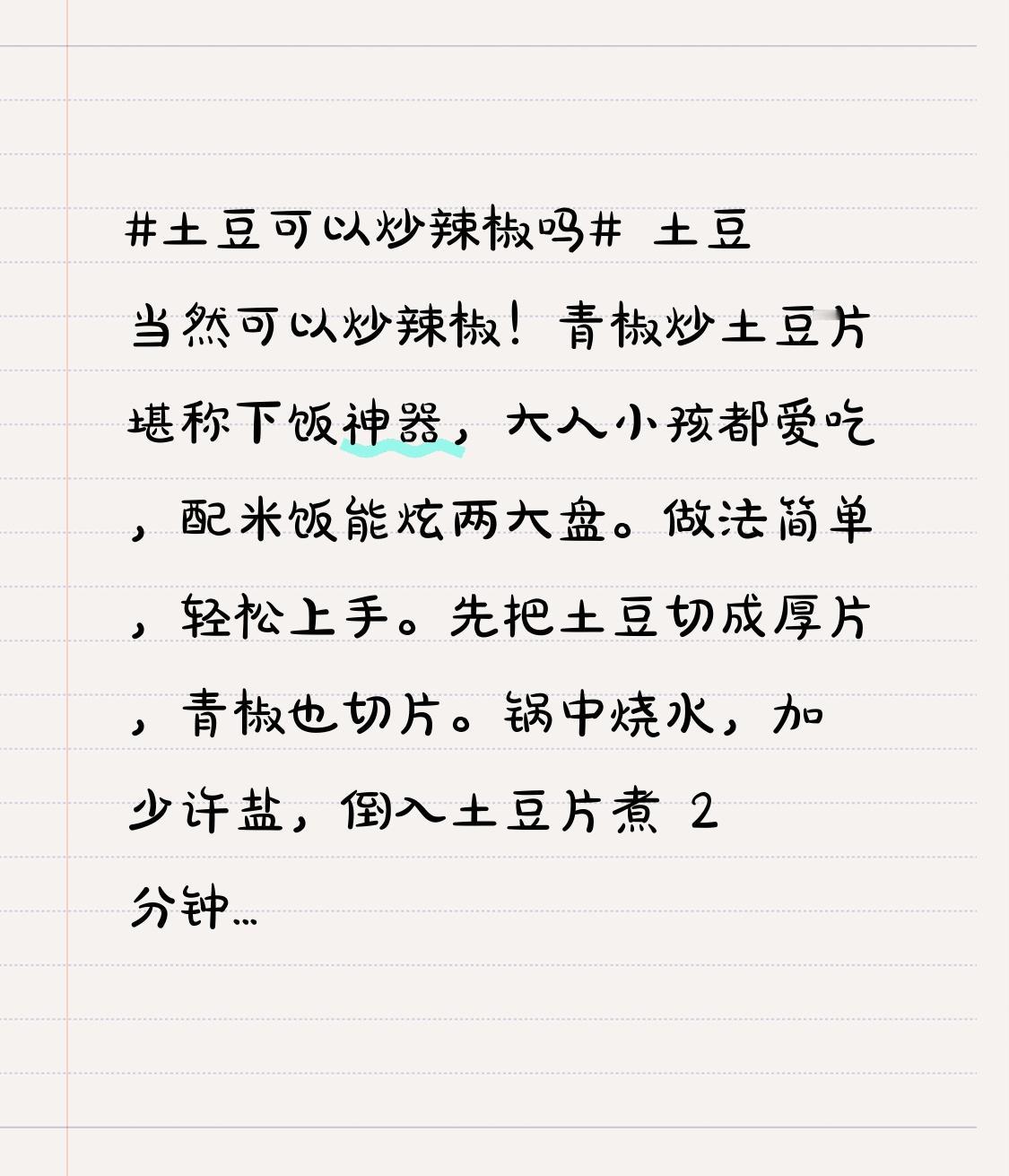 土豆当然可以炒辣椒!青椒炒土豆片堪称下饭神器,大人小孩都爱吃,配米饭能炫两大盘。做法简单,轻松上手。 先把土豆切成厚片,青椒也切片。锅中烧水,加少许盐,倒入土豆片煮 2 分钟左右,沥干捞出。起锅烧油,油温 5 成热时,下葱段煸出香味。接着倒入青椒炒至断生,再加入土豆片翻炒。调味也不难,放入蚝油、生抽、鸡精、盐和一点点白糖,翻炒均匀就能出锅。这么一道比肉还香的菜,还不赶紧试试?