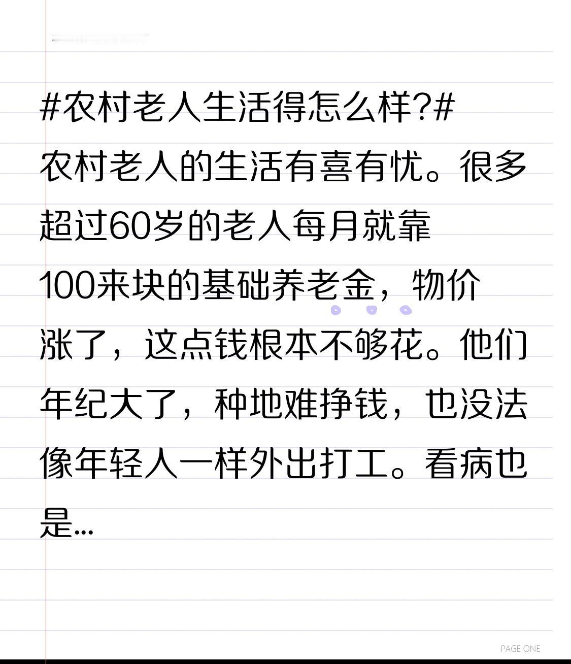 农村老人生活得怎么样? 农村老人的生活有喜有忧。很多超过60岁的老人每月就靠100来块的基础养老金,物价涨了,这点钱根本不够花。他们年纪大了,种地难挣钱,也没法像年轻人一样外出打工。 看病也是个大问题,有的老人为省钱,用便宜药、过期药,甚至信迷信,小病拖成大病。部分老人有医保卡却不会用,怕住院花钱,也不爱体检。 在养老保障上,虽有活动室、敬老院,但健康老人不愿去。能干活时,他们会帮子女分担;失能后,可能被嫌弃。 不过,也有改善的地方。国家政策在完善,基础养老金标准提高,还有地方补贴。但像村里的白婶,即便勤快一生,老了也被儿媳嫌弃,生活心酸。农村老人的生活,还有很长的路要走。