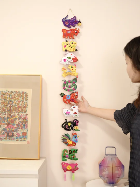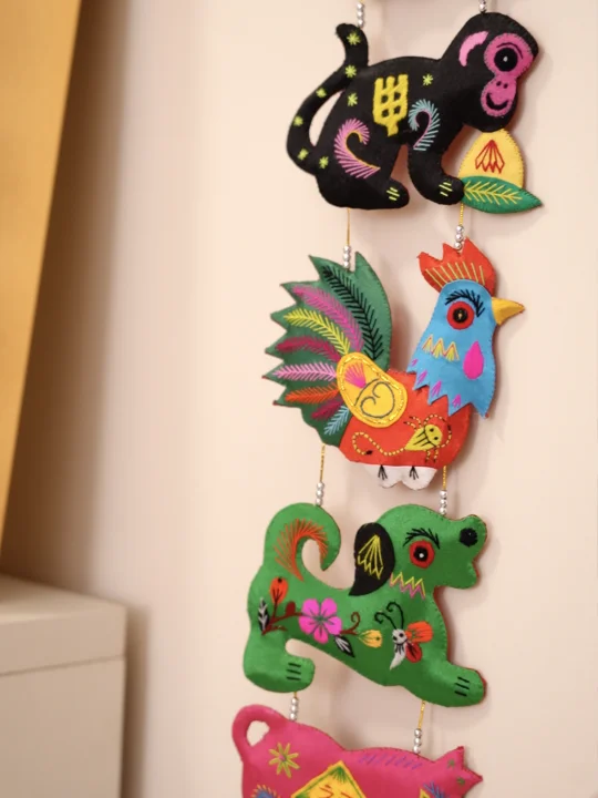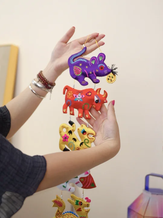 适合生活的绣品 刚做出来就自己拿了一串 特别适合放在家里挂着🏠 把十二生肖的形象做成了挂件 每个都很有神态 老鼠叼着铜钱 兔子吃胡萝卜 而不是单一的绣出动物形象🐒 贴布绣、打籽绣、平绣 运用到刺绣技艺很多 没有借用机器 是绣娘们纯手工完成👋 一串需要3天左右时间 审美没有被机械化 是从土地里生长出来的民族审美 会成为家里有记忆的物品🥰