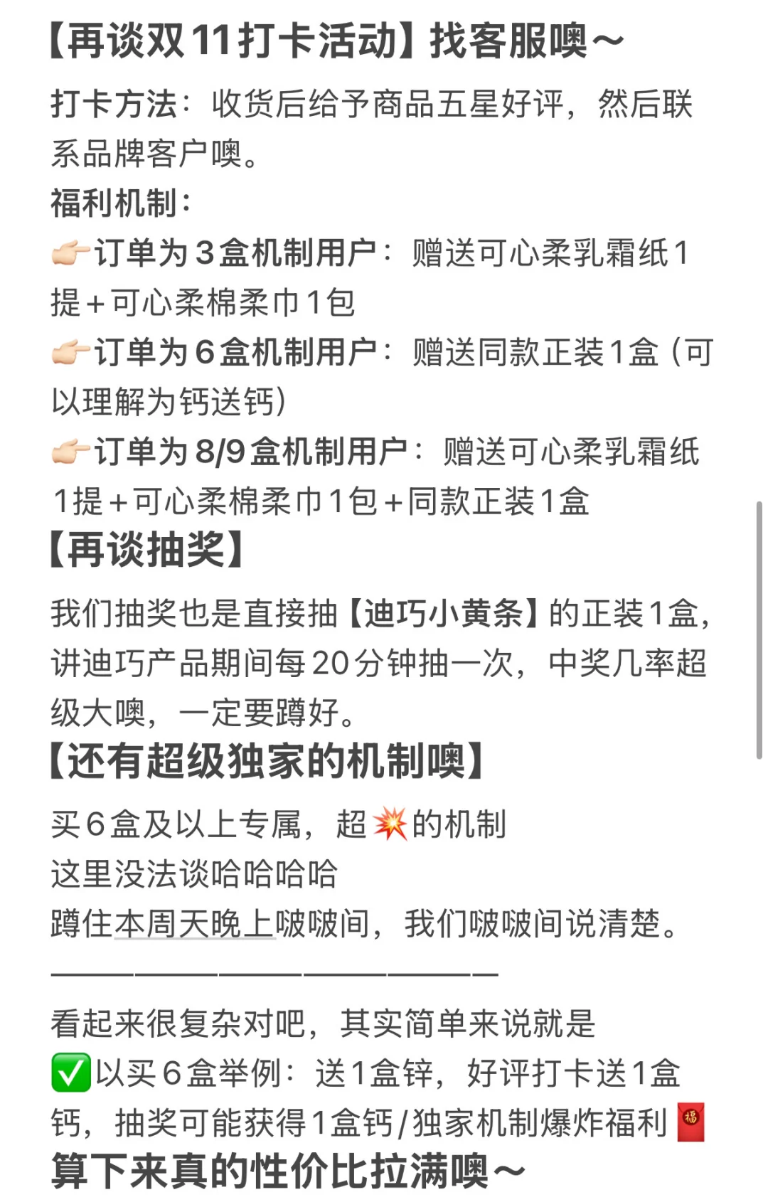 迪巧这次力度真的超级超级炸裂 尤其是我们啵啵间玩法也很丰富 买6盒能到手8盒或9盒,甚至欧神可以到手10盒 性价比拉到天花板 想买钙的一定要在今晚七点蹲好啵啵间 🧧是限量的! 🧧是限量的! 🧧是限量的! 来得越早机会越大啊朋友们