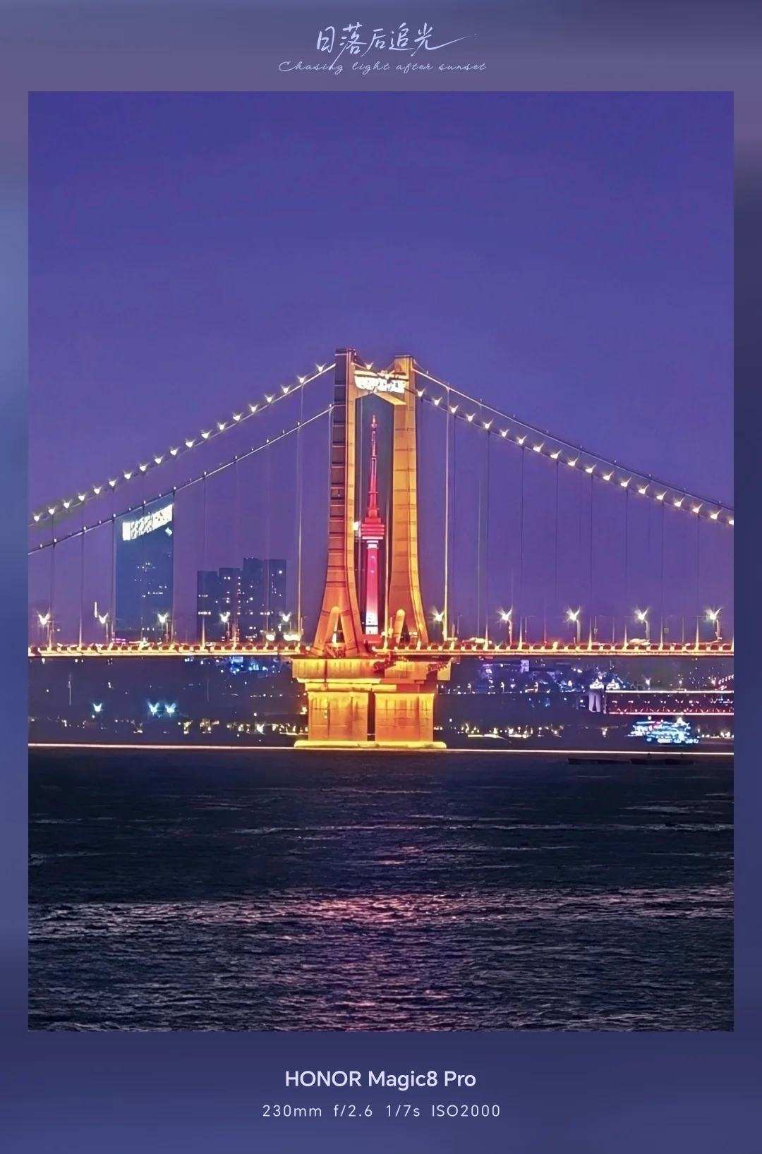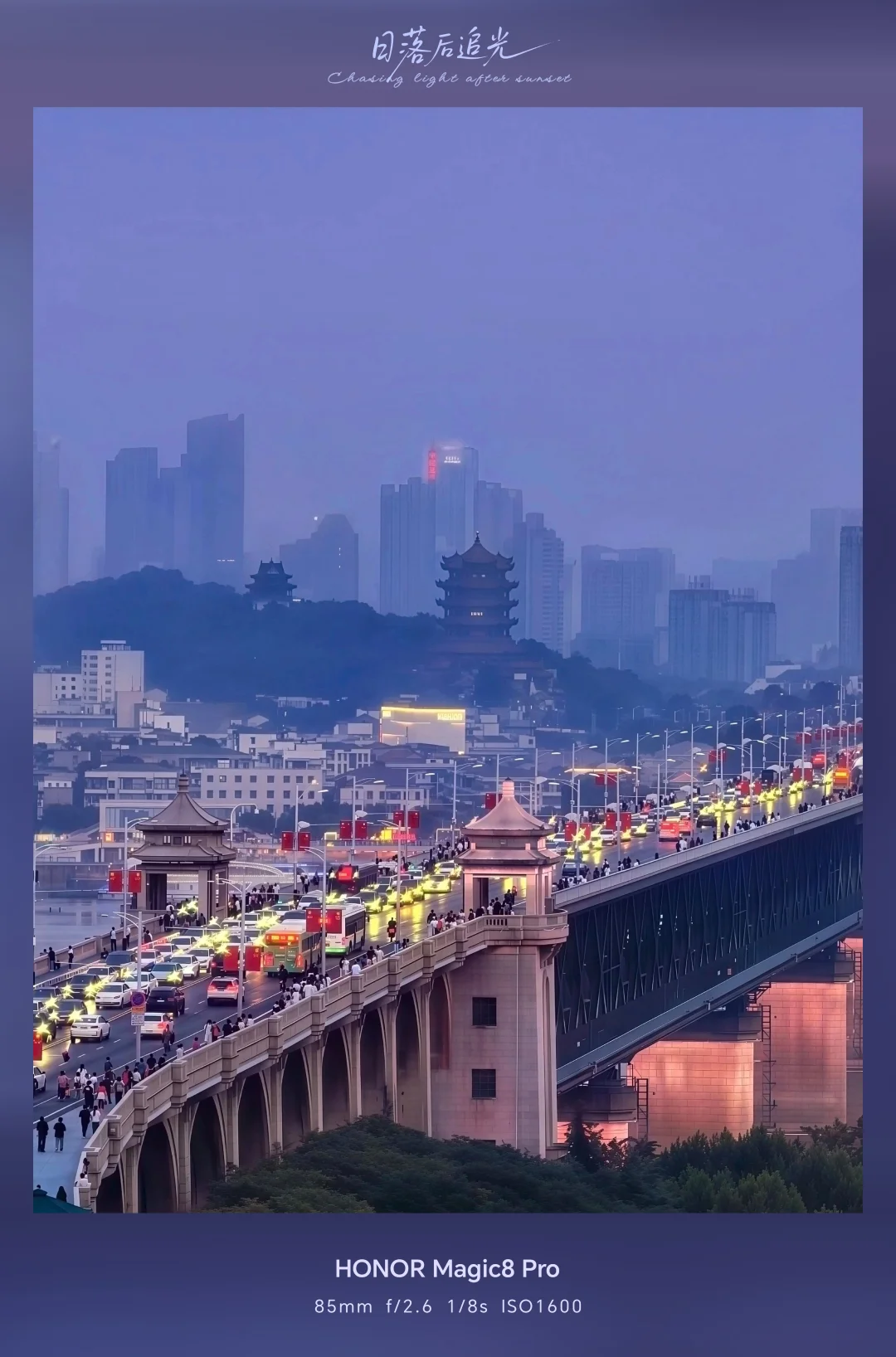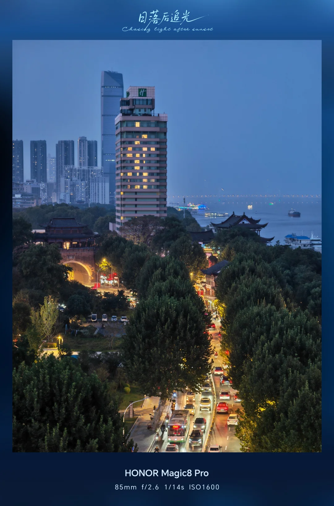 这次去武汉的头两天天气不是太好,有雾不通透,给拍摄带来了困难,多亏了荣耀 Magic8 Pro的2亿超夜神长焦,以及新出的“AI追色”功能,瞬间拯救废片,还原现场氛围感(P12、P13)!而且大家都知道,蓝调时间很短,一般只有15分钟左右,再往后天色渐黑就拍不出感觉了,“AI追色功能”彷佛帮照片进入了“倒放”,完美复刻了蓝调时刻的浪漫!
