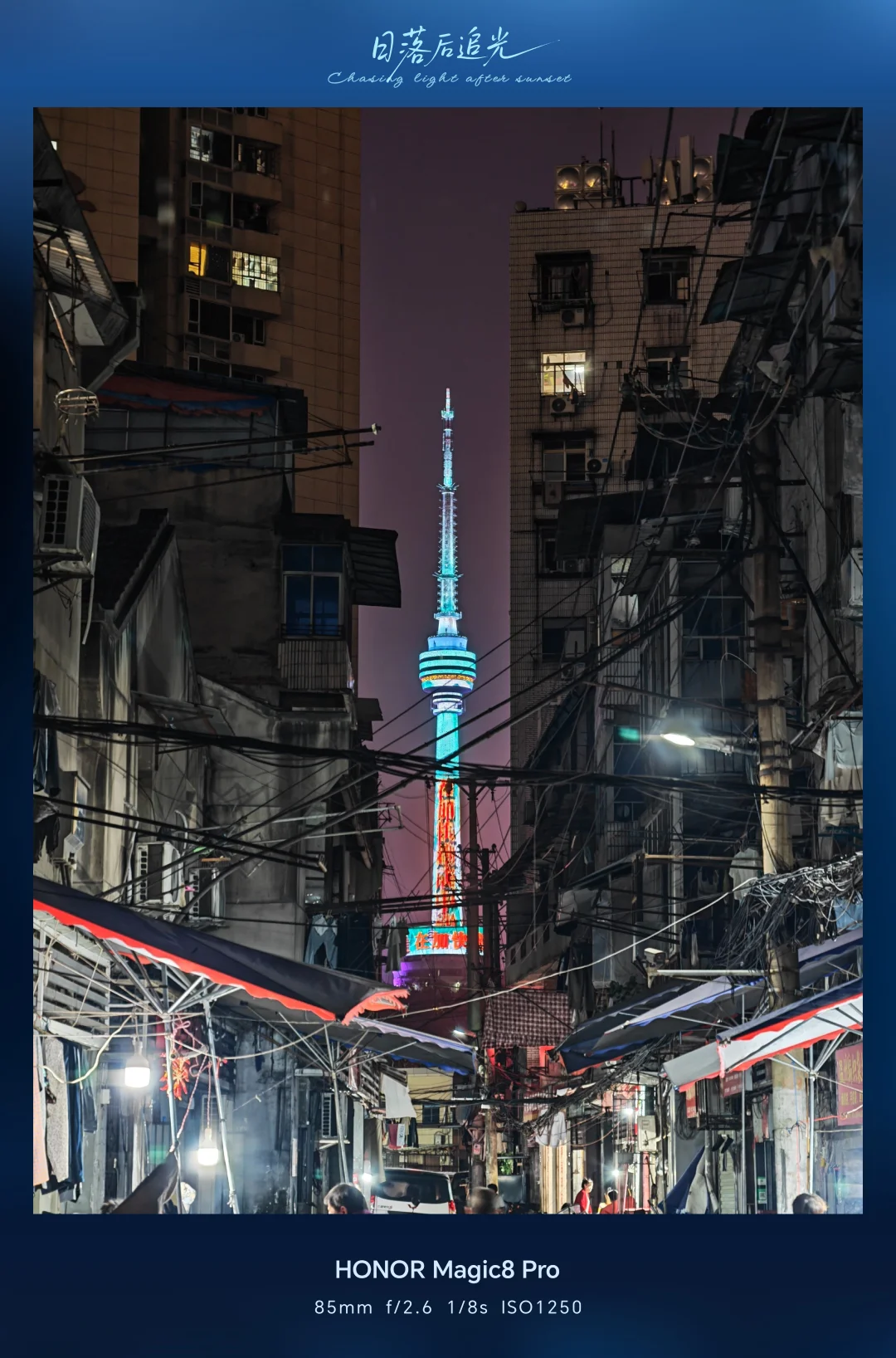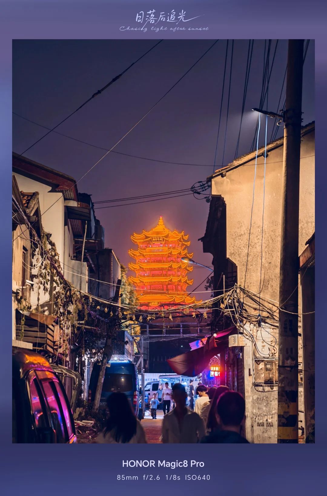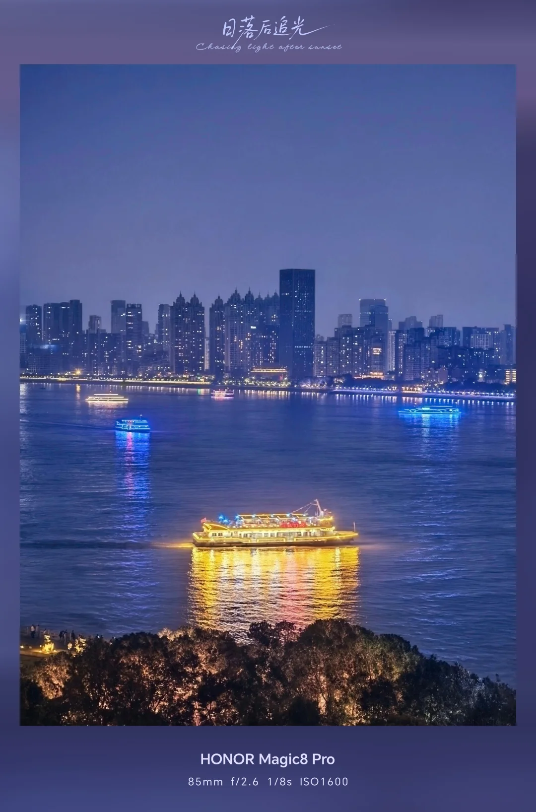这次去武汉的头两天天气不是太好,有雾不通透,给拍摄带来了困难,多亏了荣耀 Magic8 Pro的2亿超夜神长焦,以及新出的“AI追色”功能,瞬间拯救废片,还原现场氛围感(P12、P13)!而且大家都知道,蓝调时间很短,一般只有15分钟左右,再往后天色渐黑就拍不出感觉了,“AI追色功能”彷佛帮照片进入了“倒放”,完美复刻了蓝调时刻的浪漫!