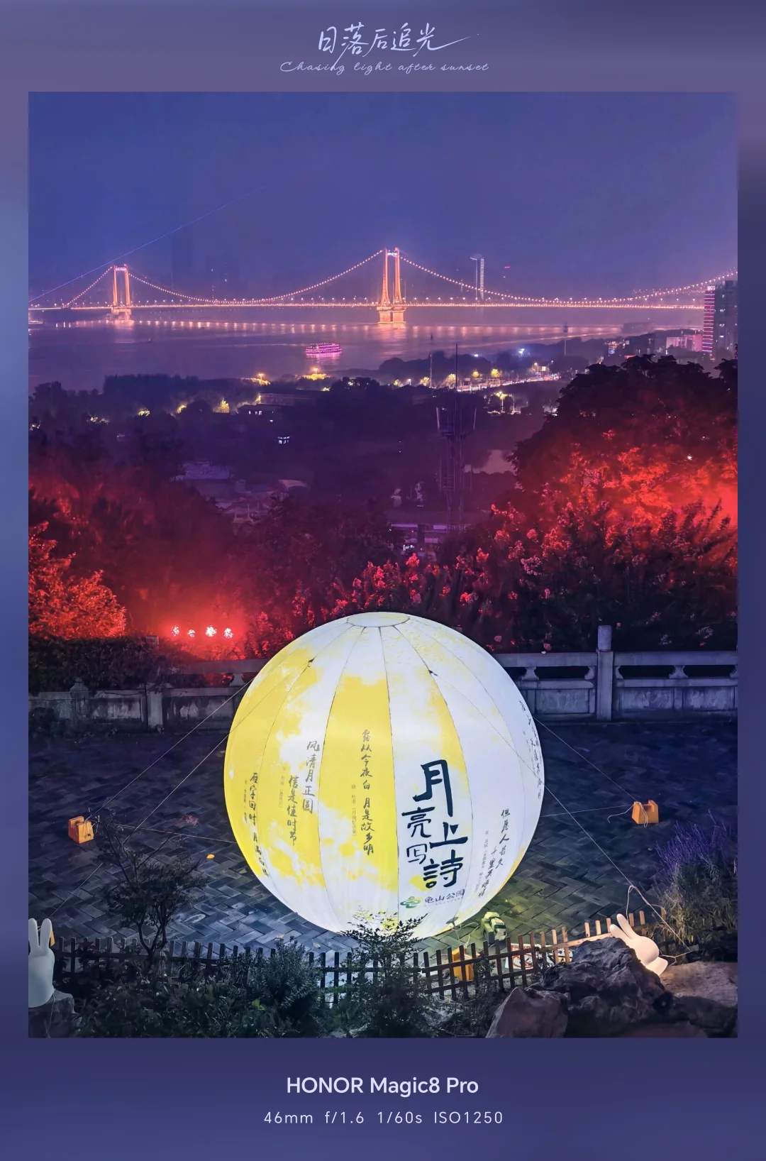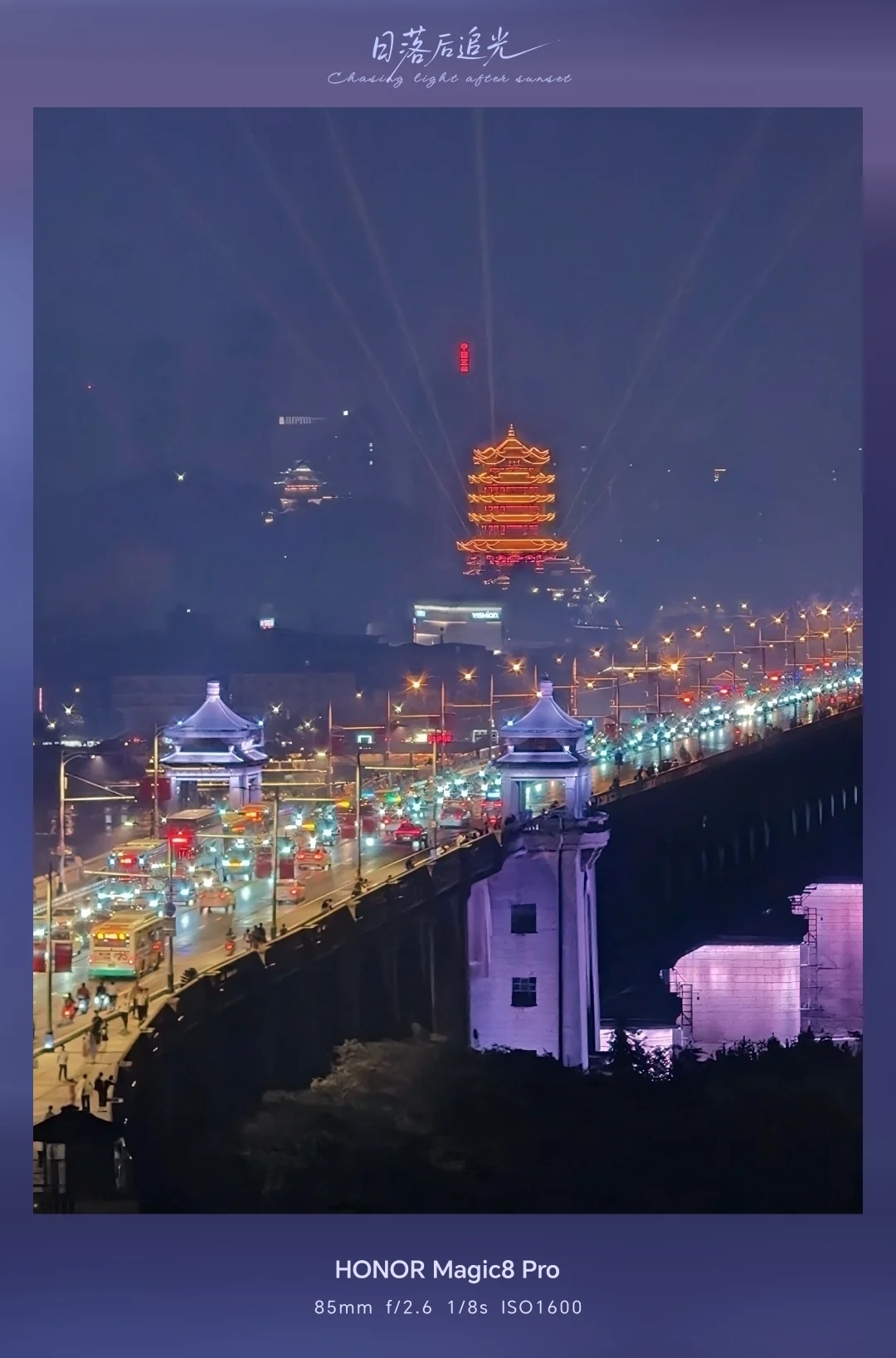 武汉法师桥,对面襄阳大厦等一众现代建筑群的灯光点亮夜空,城市繁华与自然静谧同框,加上荣耀 Magic8 Pro的两亿超夜神实在太顶了,直接能拍出夜景建筑群的质感,随手拍都是都市感大片。