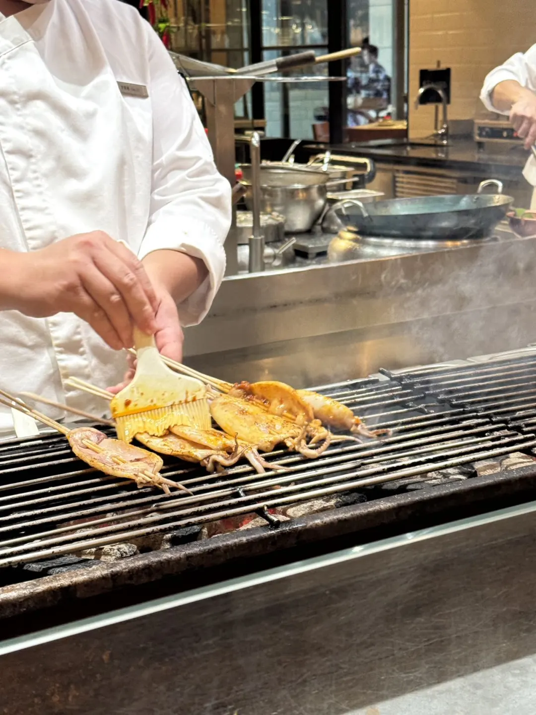 ✅烧烤区:澳洲和牛、羊排、大虾现烤,主厨会撒上秘制香料,肉汁在口中爆开~