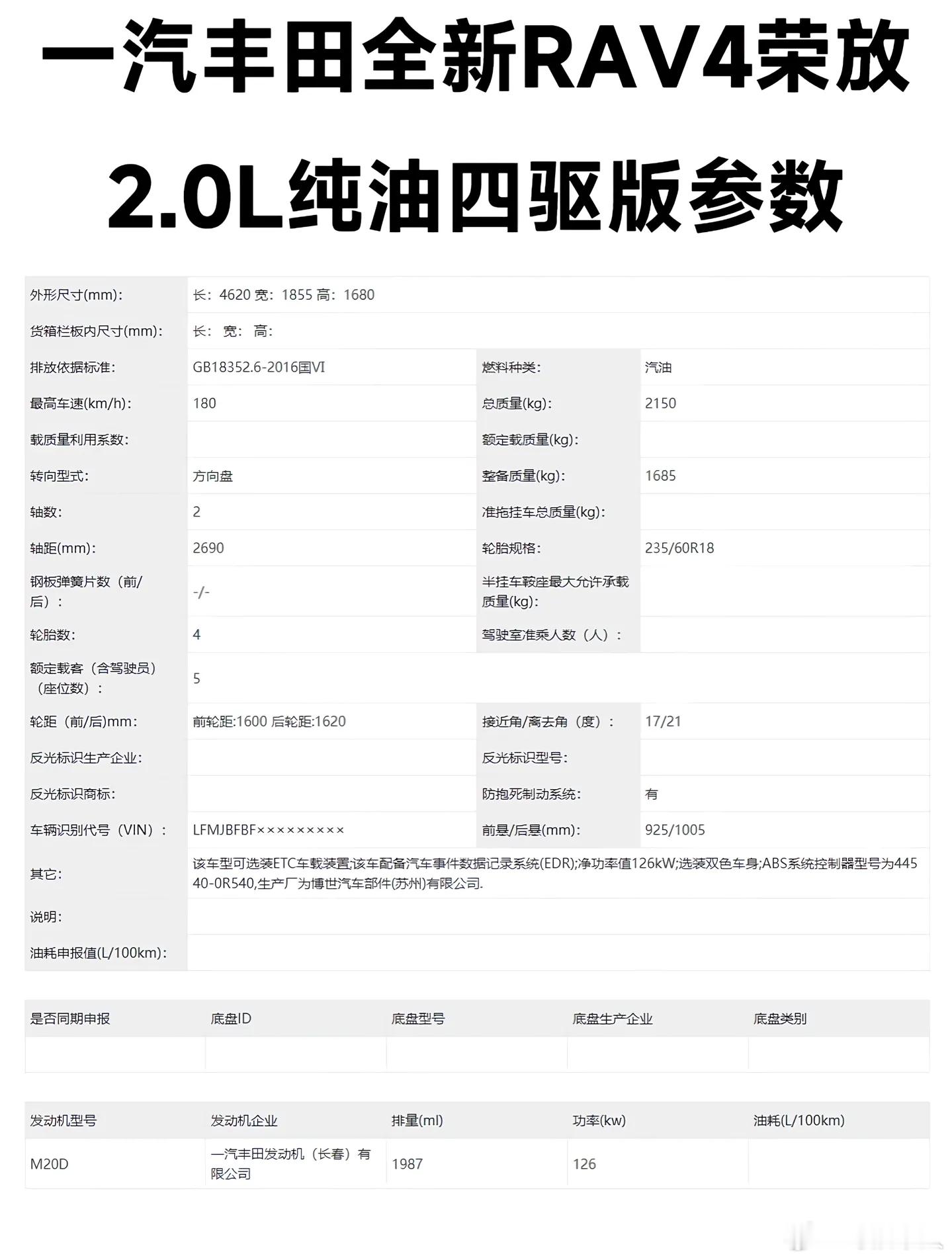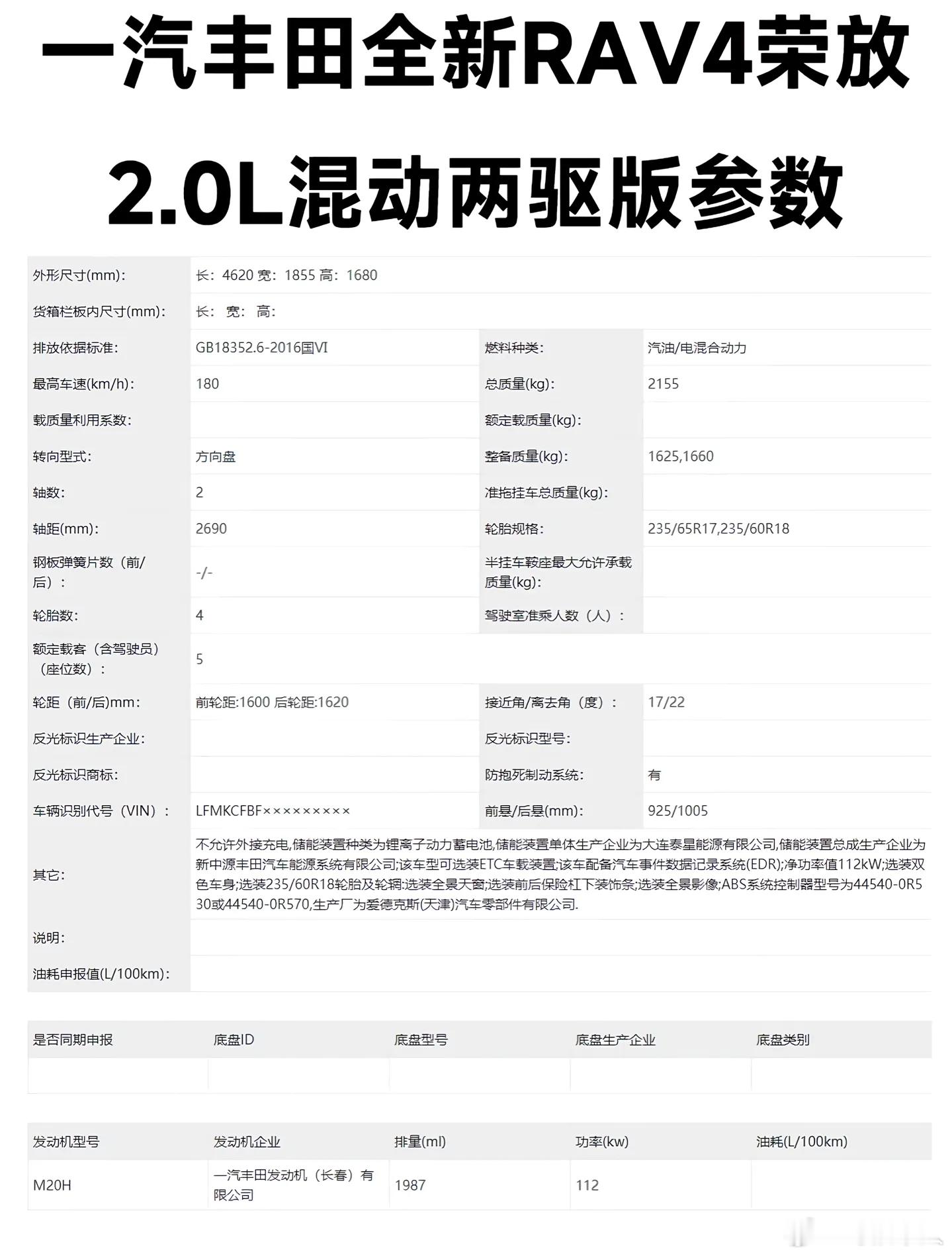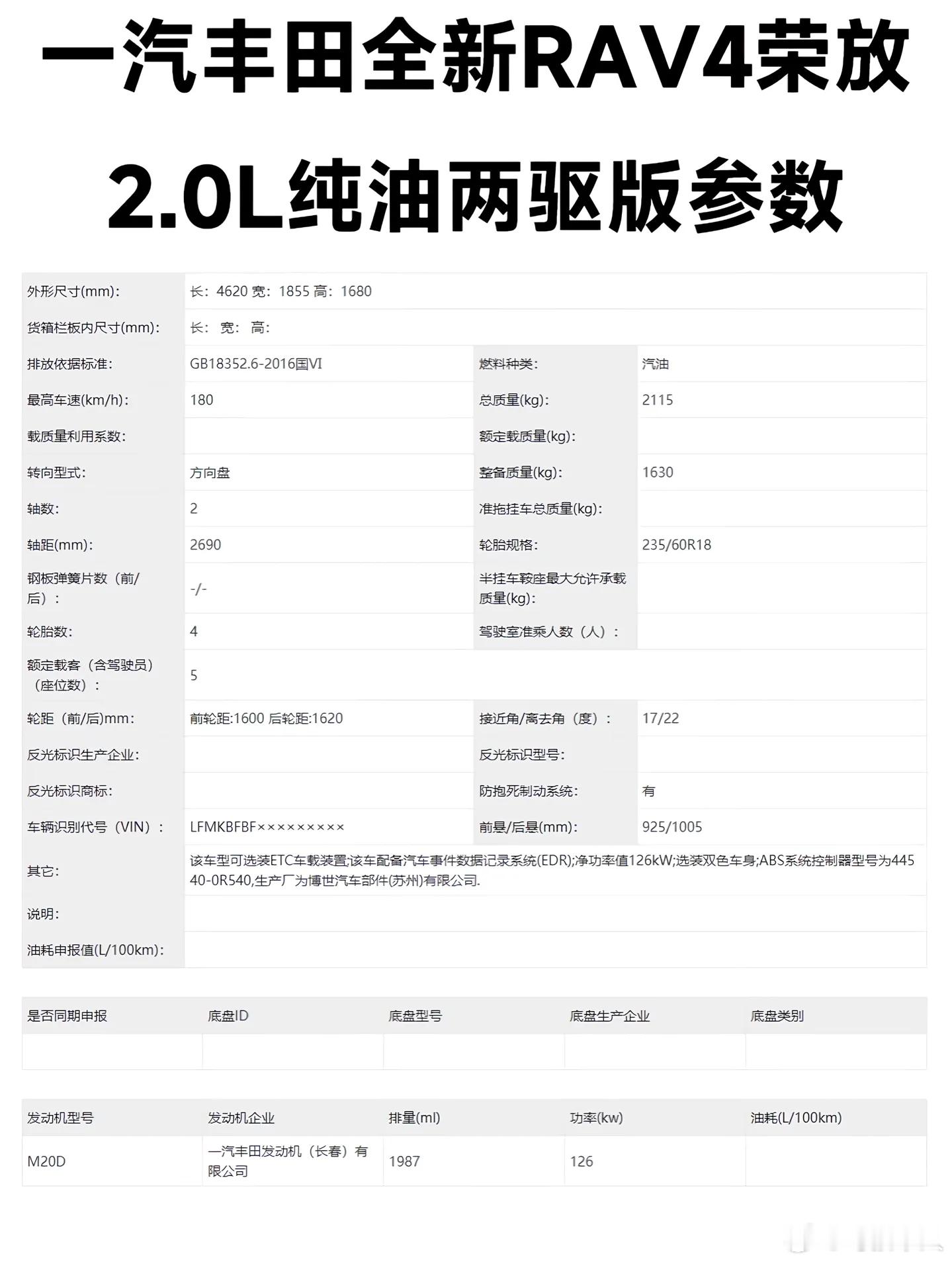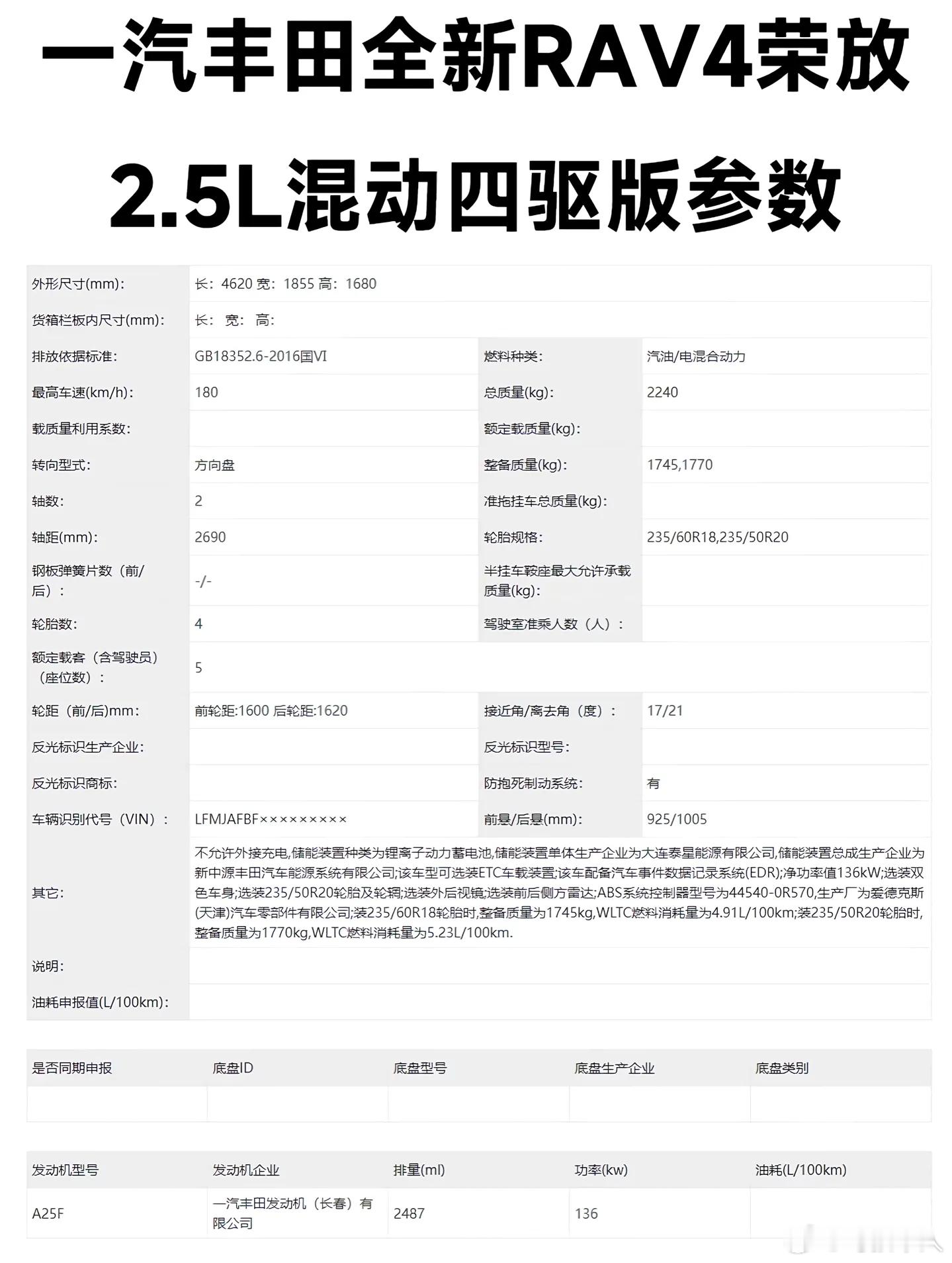 别的先不说,第五代RAV4荣放这硬派SUV的外观是真可以,感觉是有史以来最好看的一代,这次工信部申报直接整了四个版本:2.0L纯油两驱、2.0L纯油四驱、2.0L混动两驱,还有2.5L混动E-Four四驱。