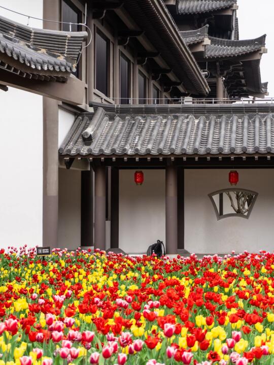 中心楼旁边有一片郁金香🌷,不算很大面积,但和古色古香的建筑相呼应,很耐看!整个园区还是很大的,有传统戏曲也有展览,饭后走走消食很合适!