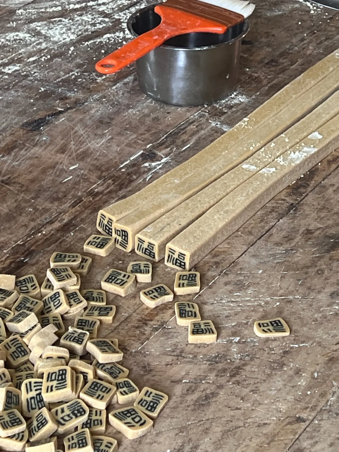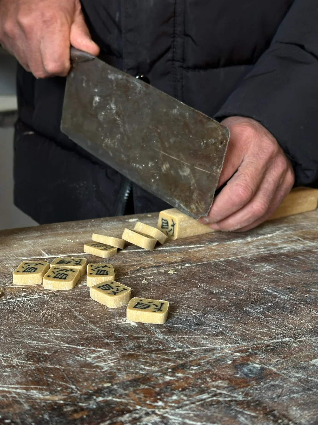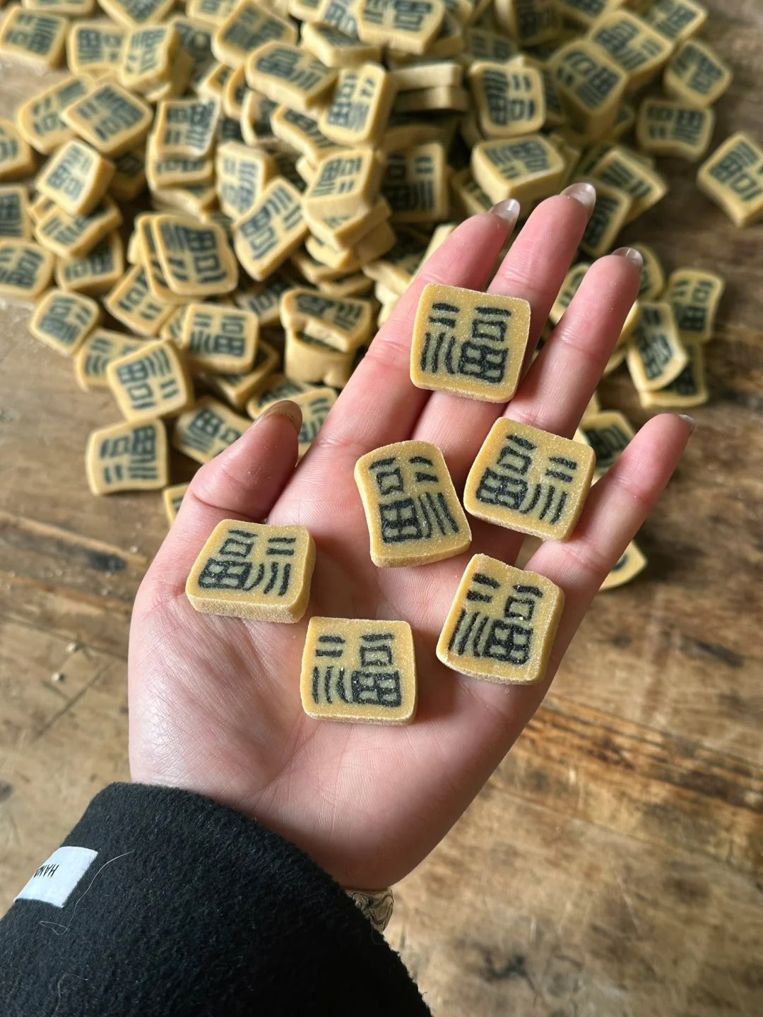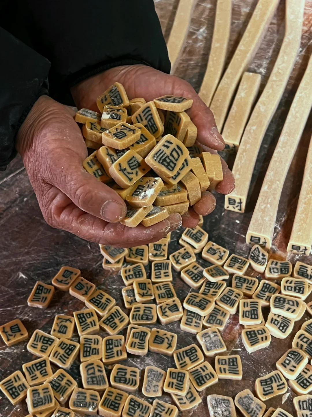 以为会很甜 结果是那种芝麻的香 加上豆子的柔绵 一点也不腻 样子跟口感反差很大!! 吃了一颗还想再来一颗 这是老祖宗传下来的字豆糖 真正的咬文嚼字 在拇指大小的糖里嵌入着完整的汉字 把吉祥与祝福吃进肚里 全国会做的手艺人不足20人 最年轻的传承人都是70岁 制作的原材料麦芽糖冷制非常快 要在20分钟完成和面、切条、堆字… 温度和厚度不一样 就会让整个糖失败 除了财、福还有囍字 特别适合做婚糖 在日常当作零食也很好 因为没有任何添加剂