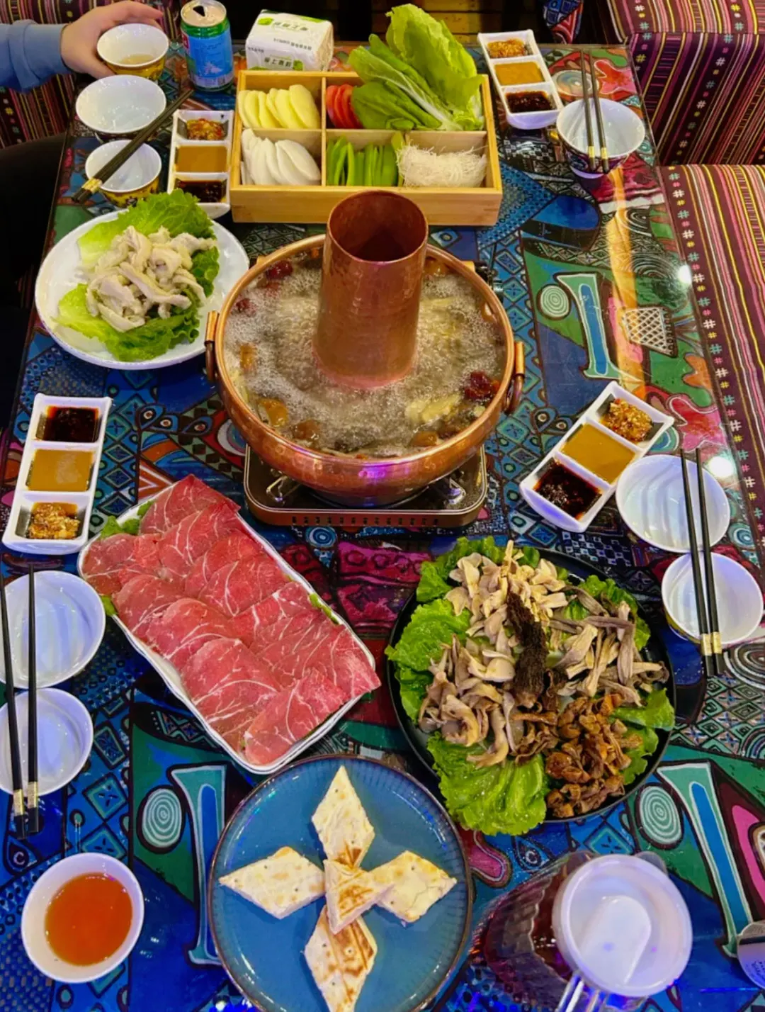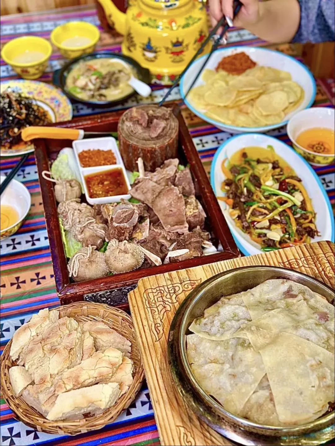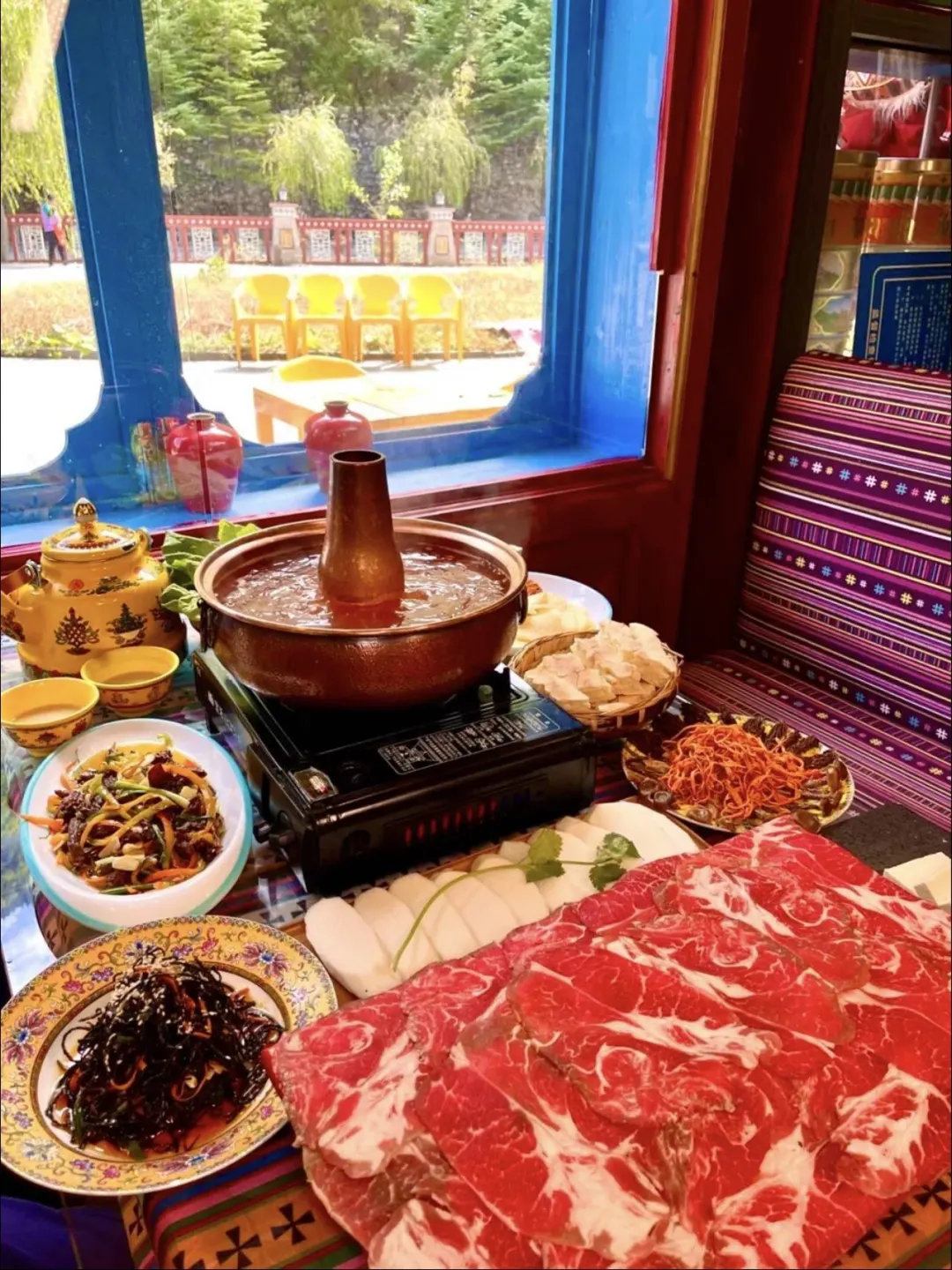 ·藏式火锅:牦牛肉 + 青稞饼 + 野生菌菇,汤底浓郁(够 2-3 人吃)