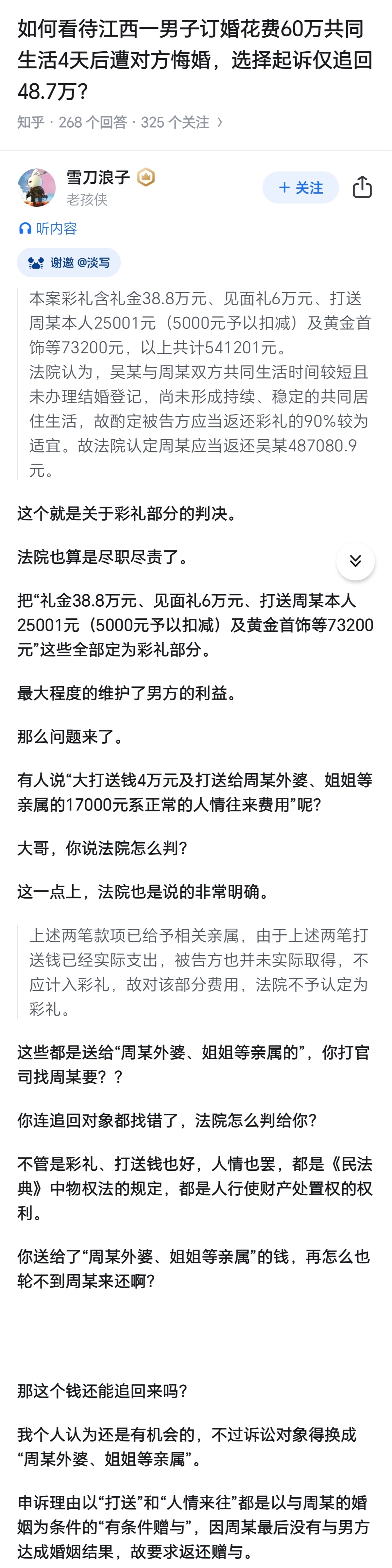 那我问你,仅共同生活4天,为什么法院不判决返还全部彩礼,而是硬扣下来5万多给女方?