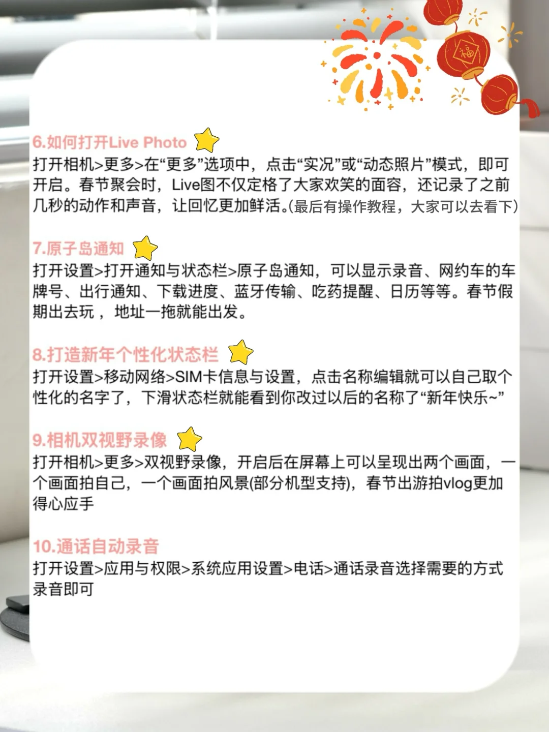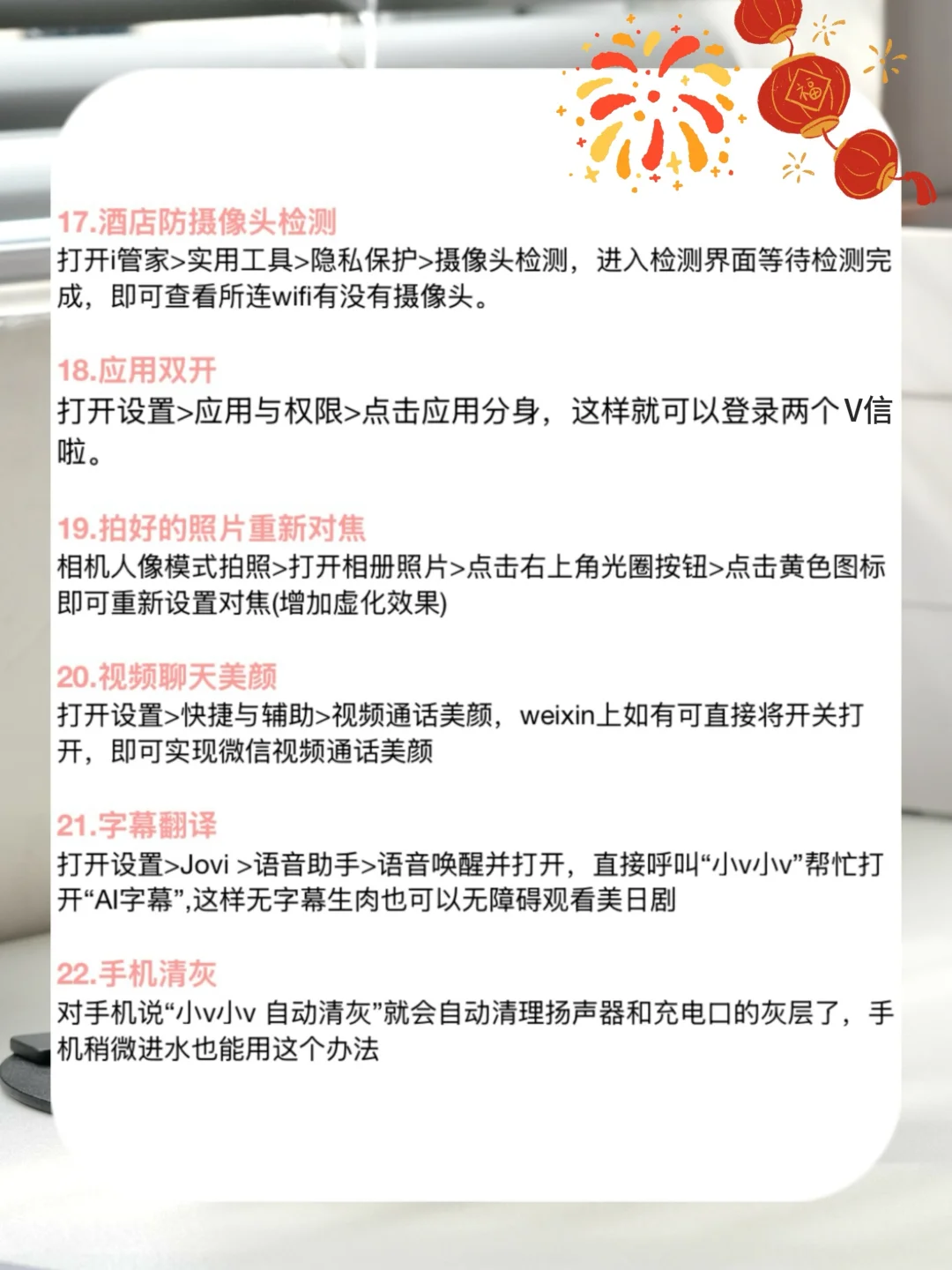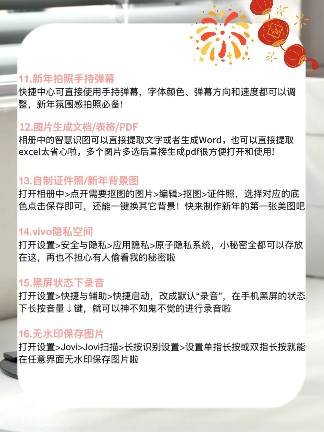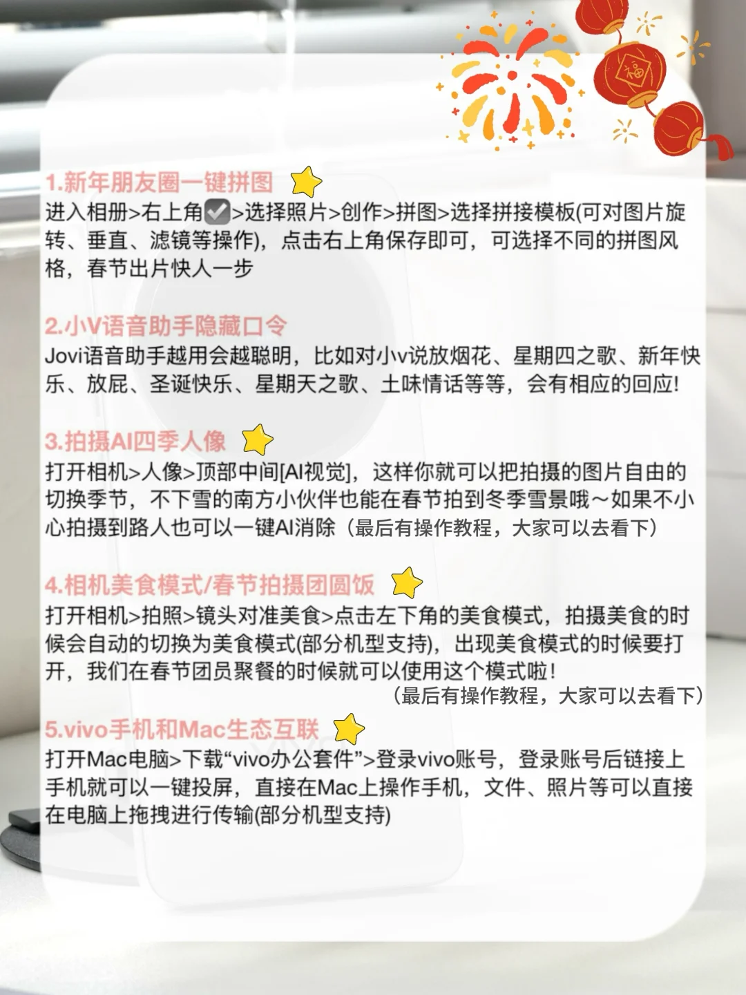 今年接触了vivo X200 Pro这款手机📲,这款手机不仅外观时尚,而且有很多狠实用的功能,今天就为大家分享一下这3️⃣1️⃣个你一定一定要知道的隐藏功能和春节技巧!(vivo其它型号也支持的~也可以参考!!)