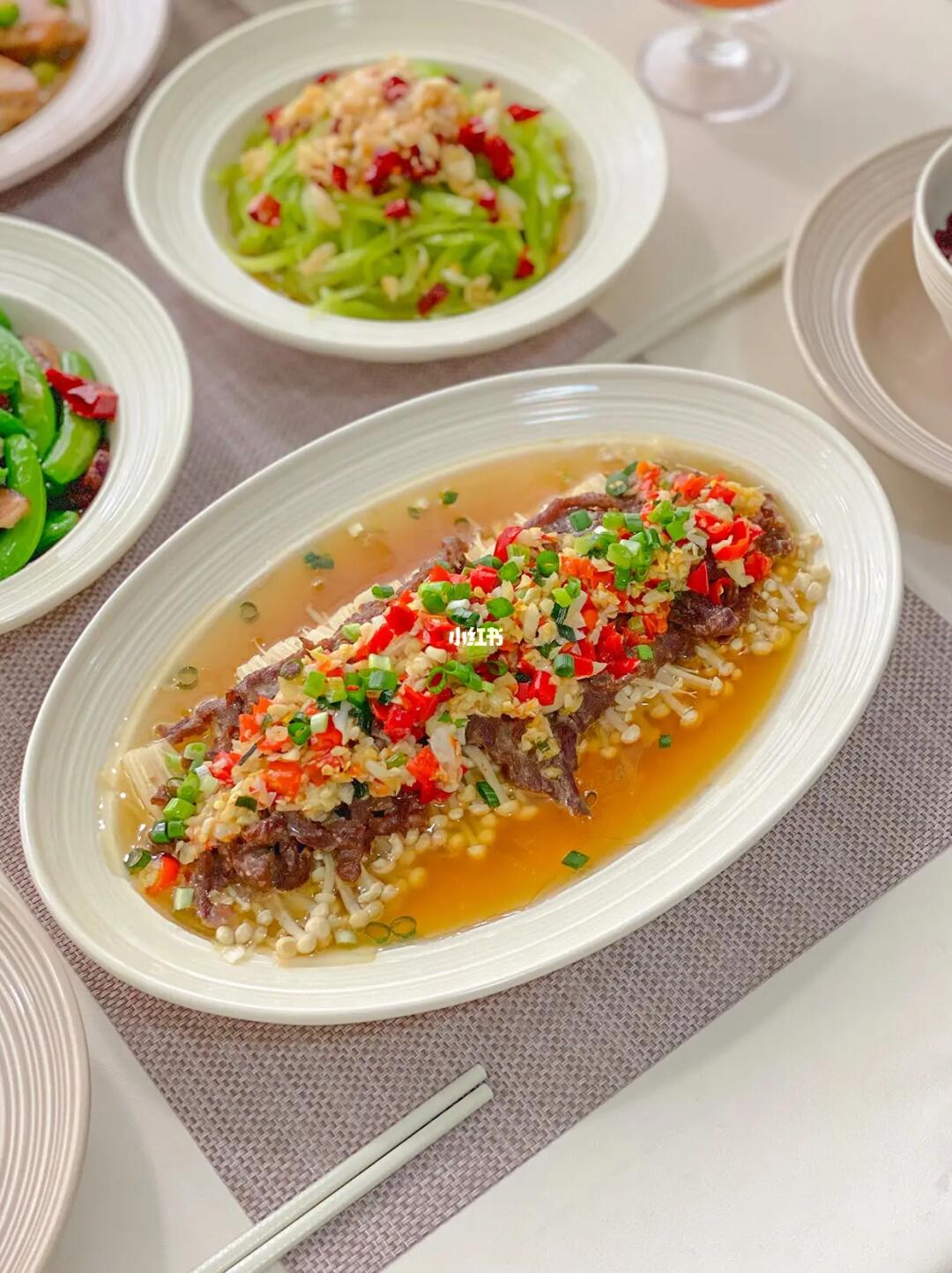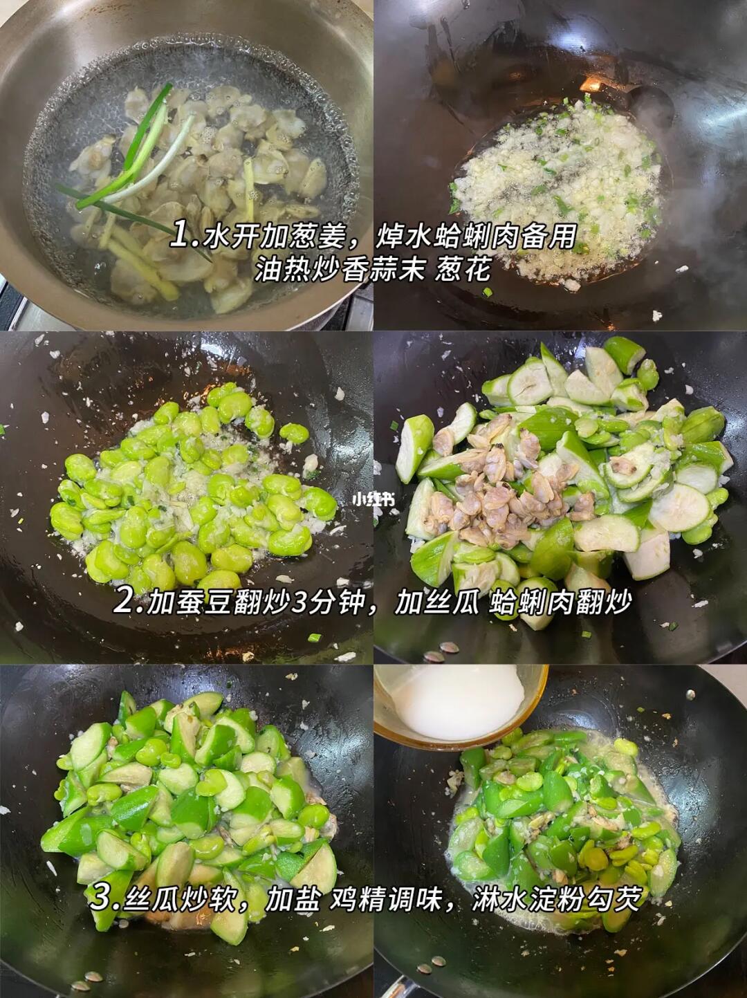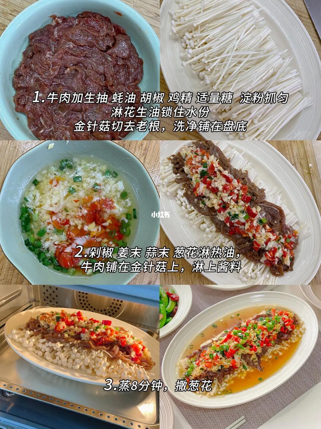 今日菜单🥣: 1️⃣香煎鸡翅 2️⃣金针菇蒸牛肉 3️⃣腊肉炒甜豆 4️⃣蛤蜊蚕豆炒丝瓜 5️⃣马兰头香干 6️⃣凉拌莴笋