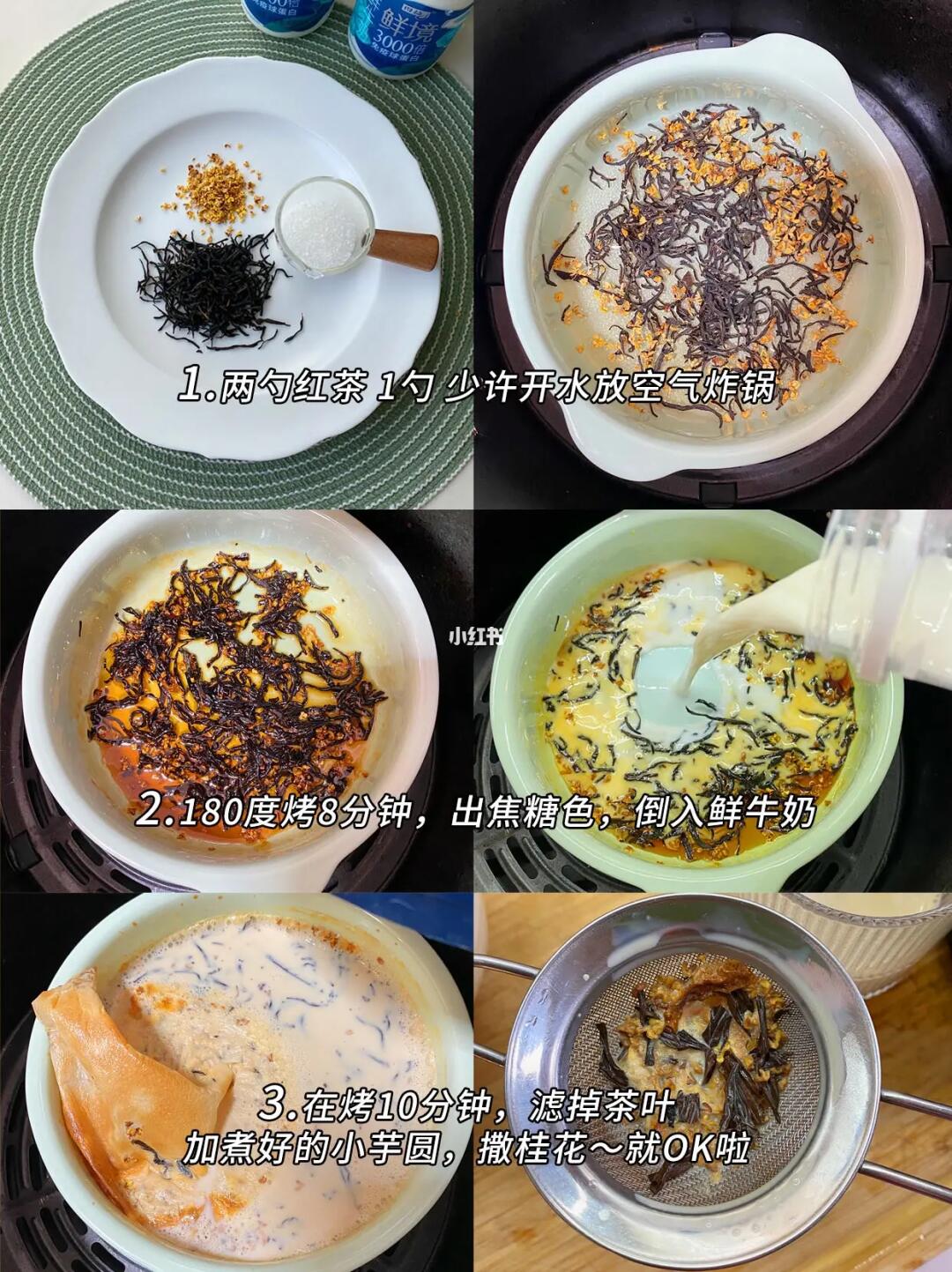 做法:2勺红茶1勺桂花1勺糖(喜欢甜的多加点)空气炸锅180度烤8分钟,烤出焦糖色,加得益鲜境鲜牛奶250ml,再烤10分钟,打开可以看厚厚的奶皮子,过滤出茶叶倒杯中,加上小芋圆或自己爱吃的配料,YYDS!
