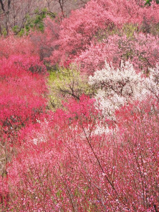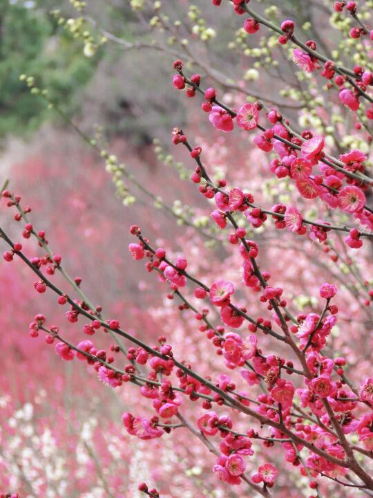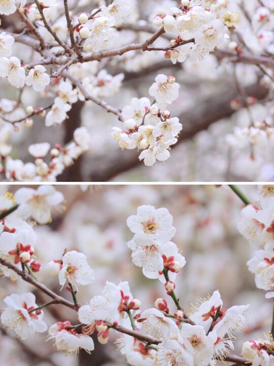 梅花从南面的山坡,一直延伸到北面的山坡下,在坡顶上,可以拍出山谷里花海的感觉