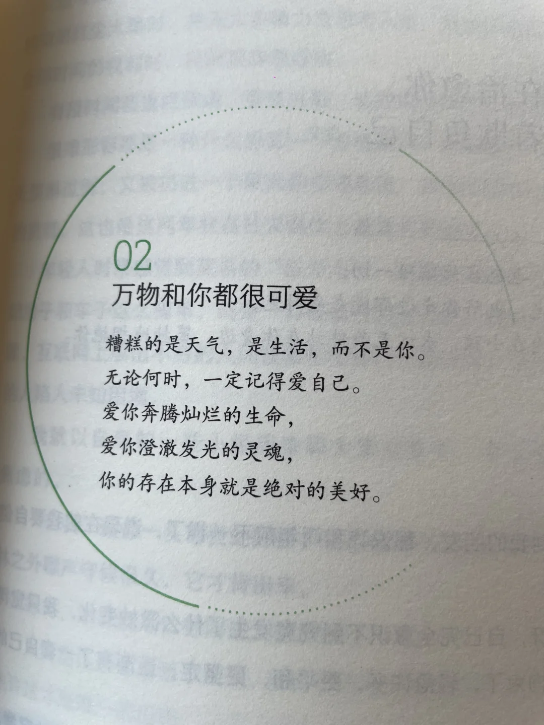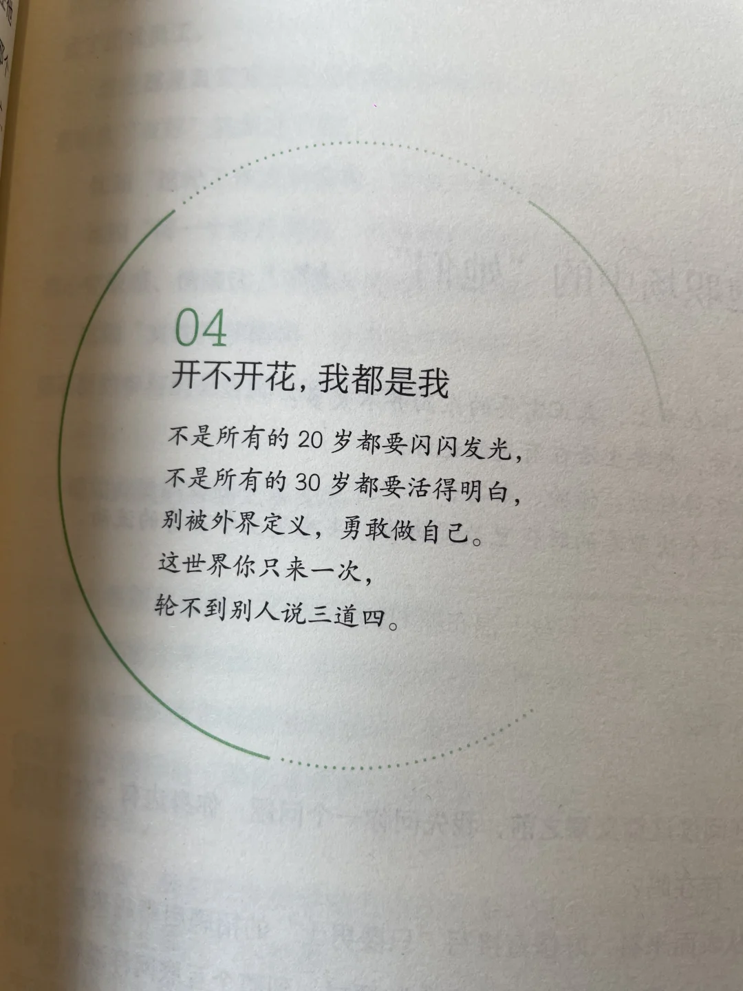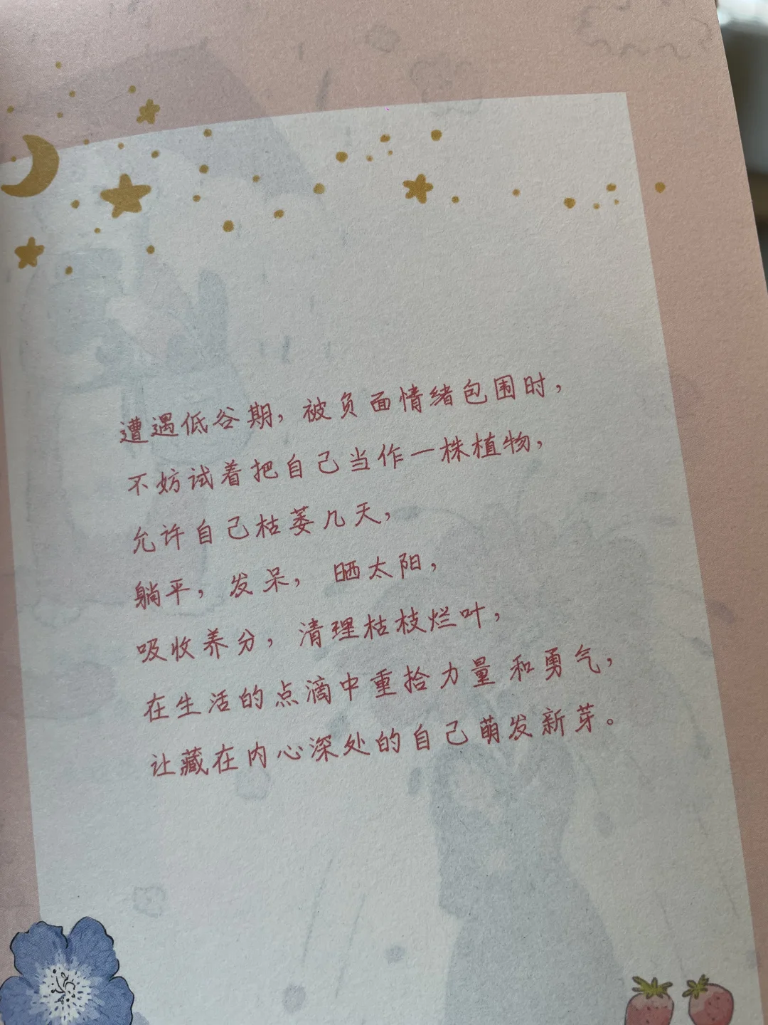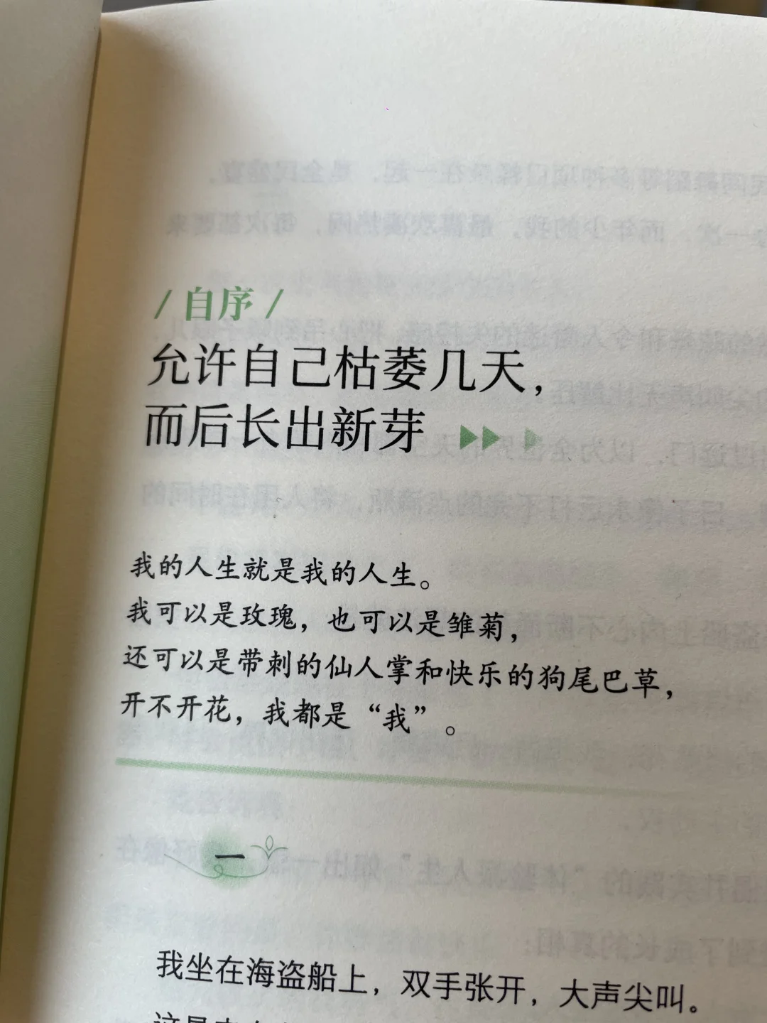 📗书名:《允许自己枯萎几天,而后长出新芽》 ✏️作者:闫晓雨 · 🌹我们可以是玫瑰 🌼也可以是雏菊 🌵还可以是带刺的仙人掌和快乐的狗尾巴草 🌸开不开花,我都是我 —— · 🏃在这个快节奏的时代,我们似乎习惯了奔跑,习惯了追逐,习惯了把自己绷成一根紧弦,这本书的书名就像一剂温柔的良药,提醒我们:累了,就允许自己枯萎几天 · 🟣它不是一本传统意义上的励志书,没有激昂的口号,也没有成功学的套路。相反,它像一位知心朋友,静静地倾听你的疲惫,理解你的焦虑,告诉你:枯萎不是失败,而是生命必经的周期 — · 🟡作者用细腻的笔触,描绘了现代人内心的挣扎:工作的压力、生活的琐碎、人际关系的复杂……这些无形的重担压得我们喘不过气来。而书中提出的“枯萎”,不是消极的逃避,而是积极的自我修复。就像自然界中的植物,经历枯萎才能迎来新生 · —— 🌴如果把我们比喻成植物,枯萎就好像人类的“躺平”,在大众定义中这是消极的、低能量的,这让我想到“文学界的摆烂王”卡夫卡说的那句:“我最擅长的事,就是一蹶不振” · 😃你瞧,原来摆烂似乎也没那么无聊嘛,太符合现在年轻人的精神状态了,焦虑的时候看到这句话真的很减压,那我们何尝不可放下手机,远离社交网络,给自己一段独处的时光;去做一些看似无用的事呢! · —— 🟣比如发呆、看云、听雨;允许自己哭泣,允许自己脆弱,接纳自己的不完美……这些看似简单的举动,却能让我们从繁忙的生活中抽离出来,重新找回内心的平静 · 🌷 “枯萎”之后,便是“新生”,书中鼓励我们,在充分休息之后,重新出发,去追寻自己的梦想,去绽放属于自己的光芒。这种绽放,不是外界的期待,而是发自内心的渴望 · 🐎人生不是一场永不停歇的马拉松,而是一场有起有落的旅程。累了,就允许自己枯萎几天,积蓄力量,然后,以更饱满的姿态,迎接生命的绽放