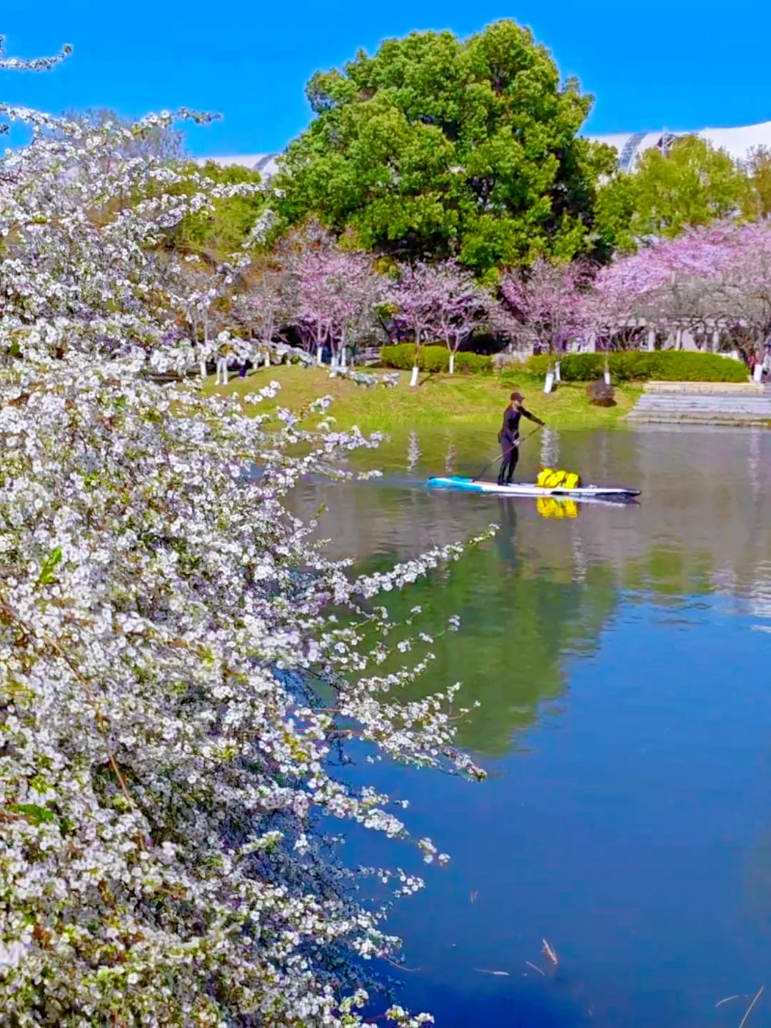 ✅这个季节花开了、树绿了,湖面上有人划船、玩浆板,坐在湖边看看景、吹吹风真的太舒服了