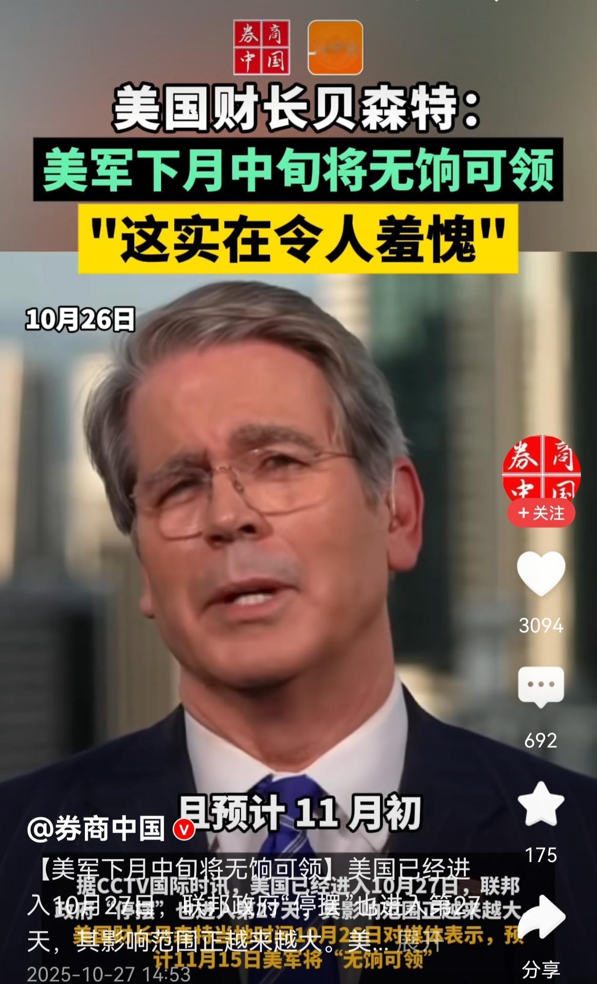 真心奉劝美国财长千万别心软, 和东大的贸易谈判要强硬, 因为贸易战在再多几天,美国国内就会自乱阵脚。 美财长说,为国家出生入死的军人下个月可能就领不到军饷,军赏最久只能维持到11月15日,这个是我万万没想到的,一个世界第一的国家,最先断的却是军费。 试想一下,如果保家卫国的军人都开不起工资了,那这个国家还谈什么战斗力,凝聚力,马上就会散沙一片了,以前还不理解我们国家为什么不喜欢去别的国家驻军,为什么不喜欢去干涉别人家的事,现在明白了,现阶段什么都没有发展经济重要,经济稳定了,人心就稳定了,内部就团结,就是钢板一块,不会被轻易击垮。